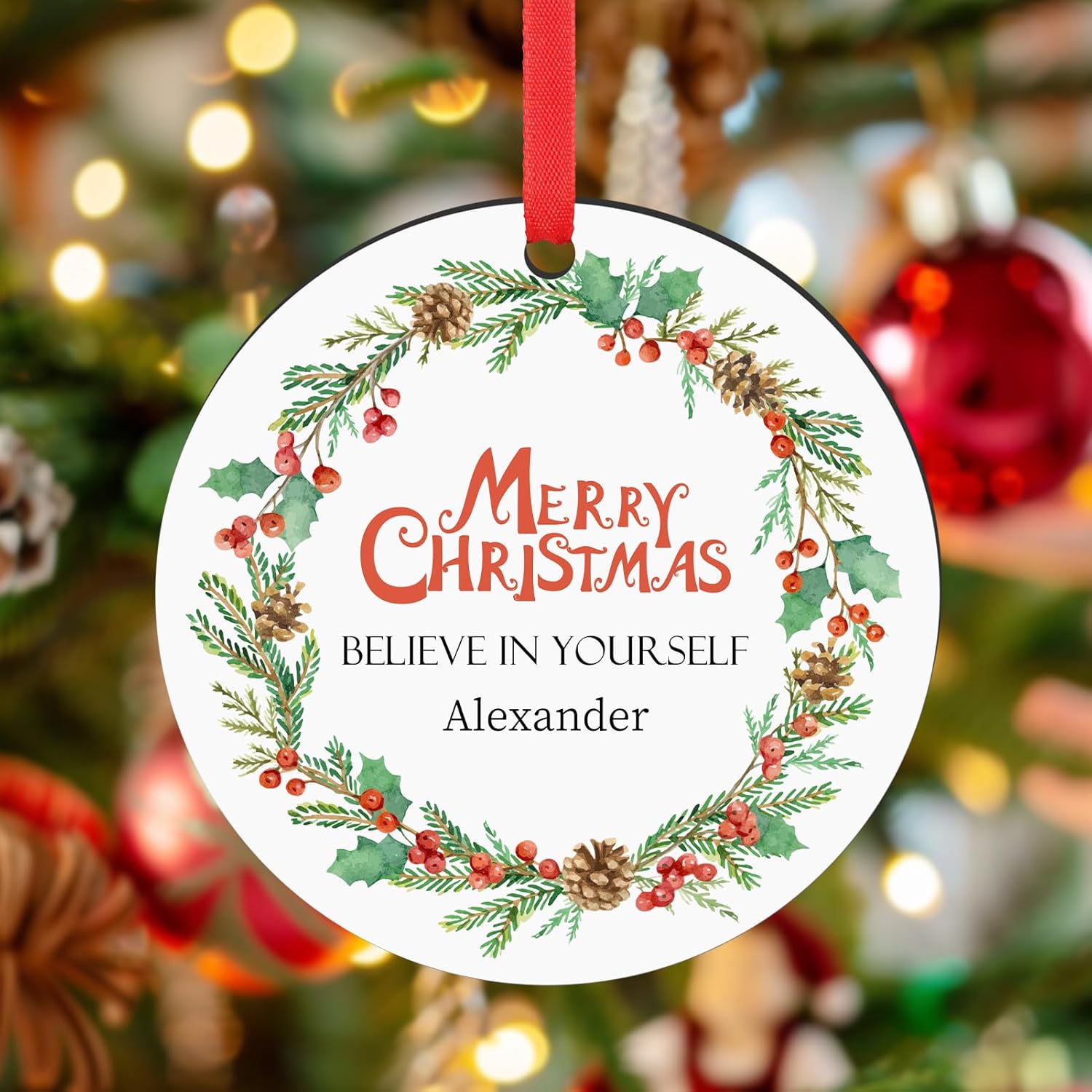 - 【Double-Sided HD Printing Christmas ornament Personalized】Custom Christmas ornament for Christmas tree use HD printing technology, double-sided printing, bright colors, not easy to fade. About 2.68", you can upload the desired photo, words, text, logo, image, saying, number, name,we will print the text on the custom ornament, give personalized family ornament to him or her as Christmas gift ideas