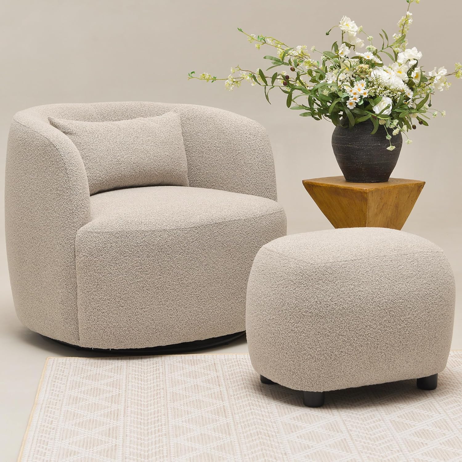 - Package Includes: 2 x boucle swivel barrel chairs (Dimensions: 32.7"D x 34"W x 29"H, no assembly, one toss pillow); 2 x boucle upholstered ottomans (Dimensions: 18.5"D x 23"W x 16.5"H, simply screw legs into pre-threaded holes). Two throw pillows includes in this living room boucle chair ottoman furniture set.