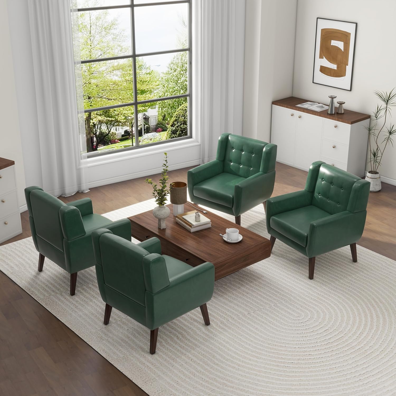 UIXE Faux Leather Accent Chairs Set of 4, Modern Arm Club Chair Upholstered Armchair for Living Room, Comfy Single Sofa Seats Button Tufted Reading Seating, Green