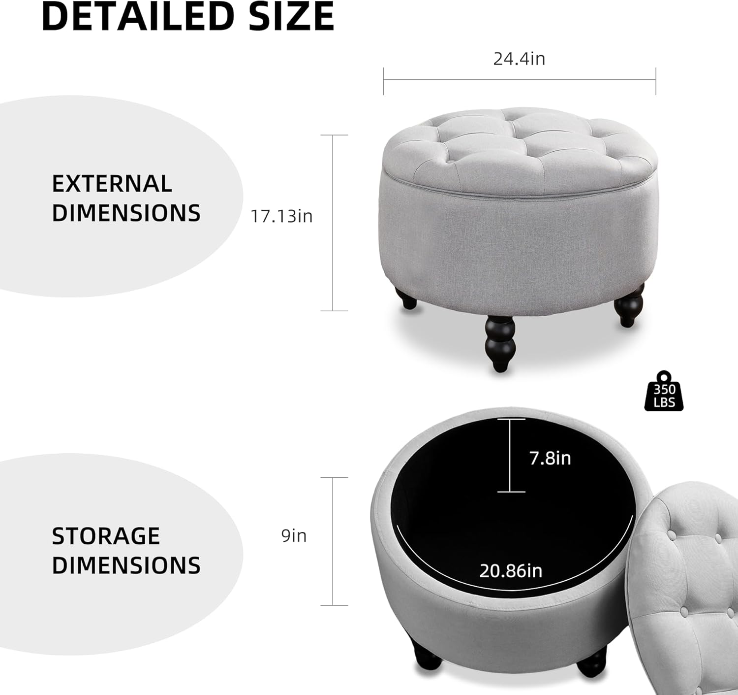 Fabric Round Ottoman with Storage, Upholstered Tufted Storage Footstool, Modern Wooden Coffee Table for Living Room, Bedroom,Light Grey