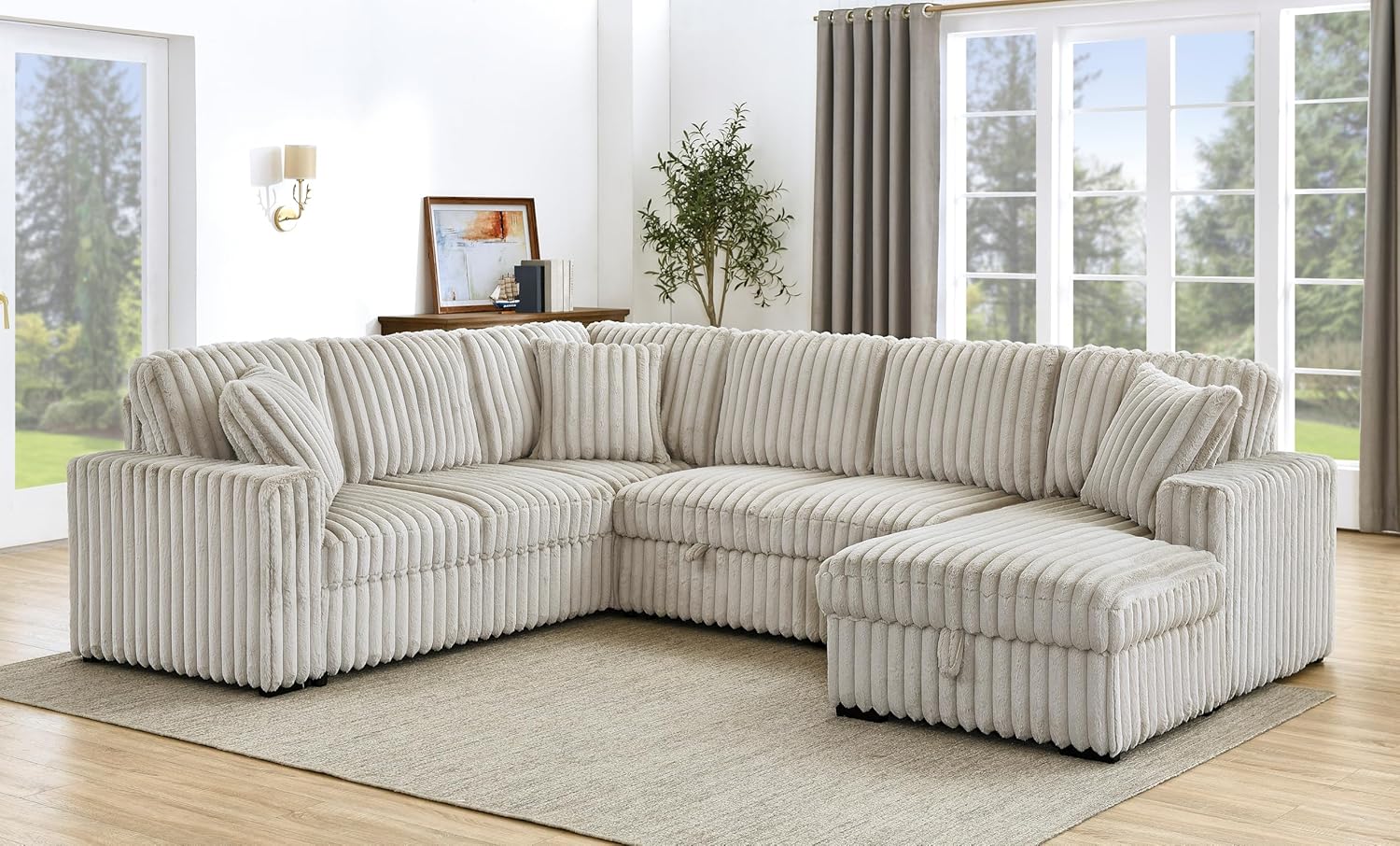 THSUPER 122-Inch Oversized U Shaped Plush Corduroy Fluffy Sectional Sleeper Sofa with Pull Out Bed, Storage Chaise Lounge and USB Charging Port - Beige