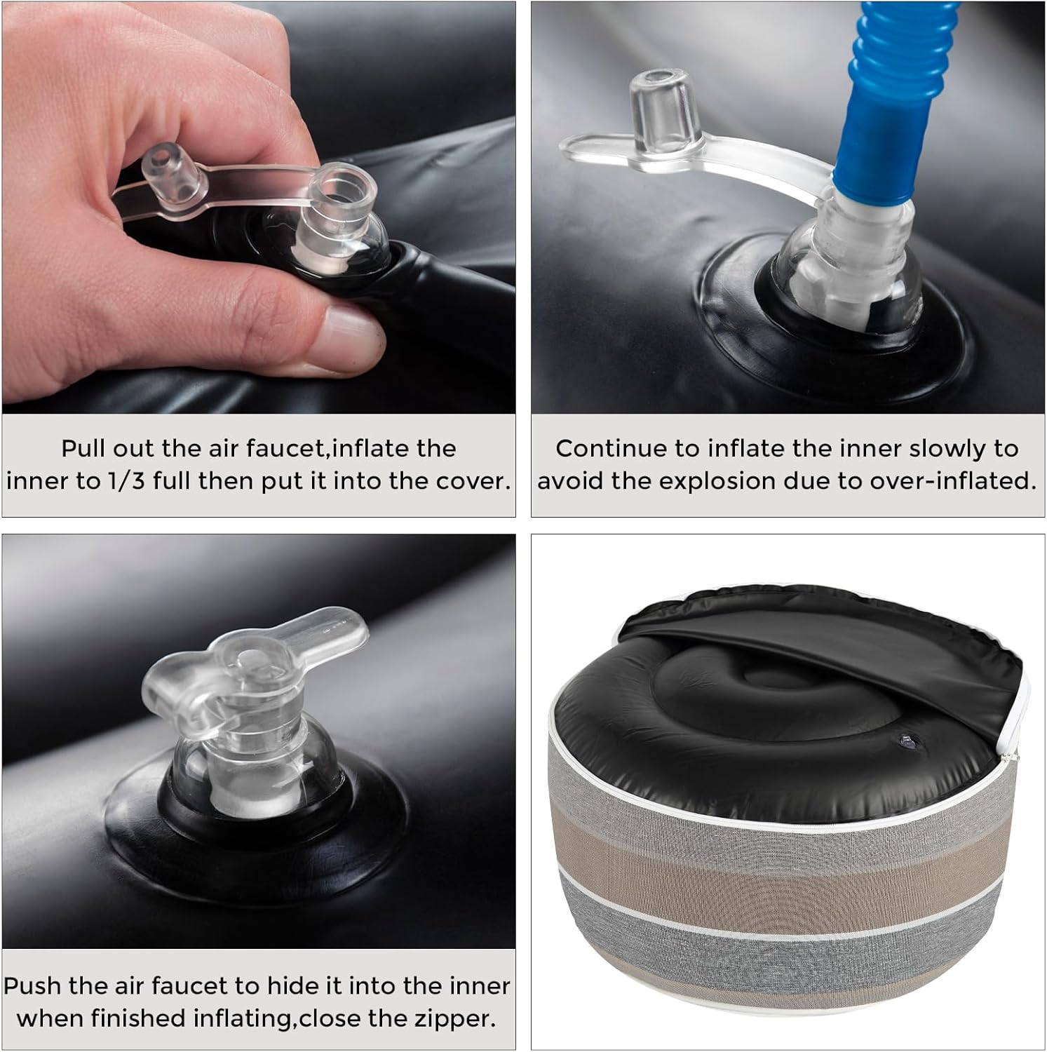 - ăDurable Outdoor Materială-Inflatable ottoman cover made from durable, waterproof material that can withstand exposure to all weather. Fade-Resistant keep its original color and pattern even if exposed to the direct sunlight for over 500 hours. The black inner made of waterproof thick PVC fabric that can bear up 300 lbs.Very easy to clean and maintain.