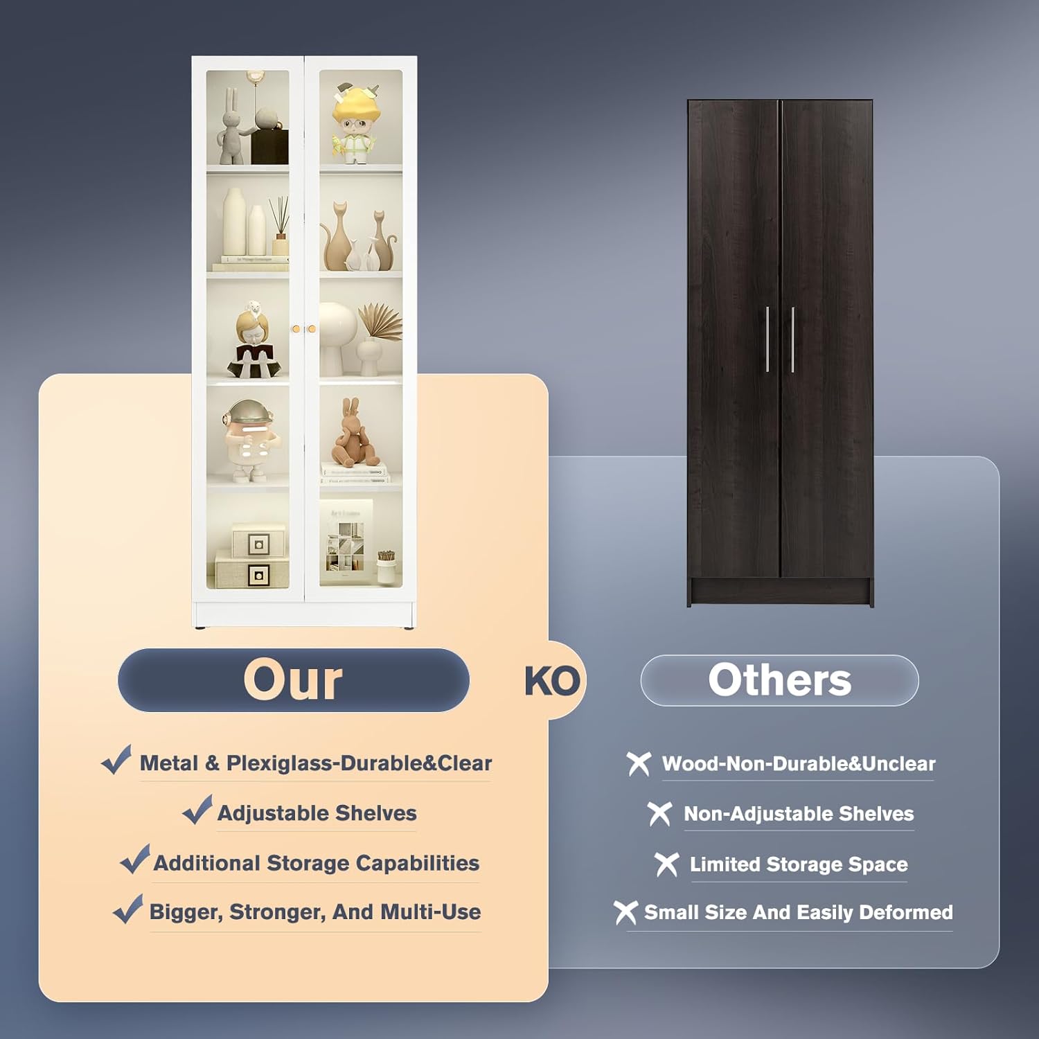 - Storage Cabinets for Multiple Purposes:A nice dust proof display cabinet to store a variety of books, collectibles, dishes and more. This steel storage cabinet can be used as a display cabinet for curios, books, artwork in your living room. It can also be used as a glass display cabinet, bookshelf, media cabinet, miscellaneous cabinet in office, bathroom, kitchen etc. With local warehouses in USA, we are able to provide fast deliveries.