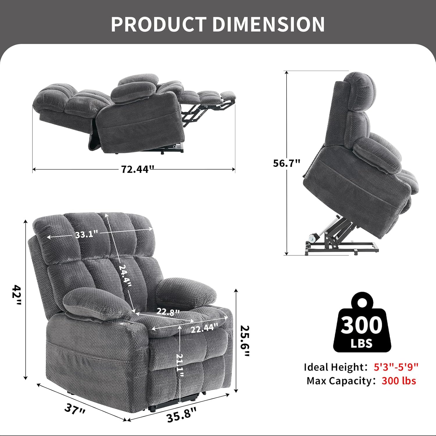 - Dual-Motor Lift Chair for Elderly:Dual-motor structure, enabling the backrest and footrest to be adjusted independently in position.The power lift recliner adjusts to any angle between 105°-170° with an easy-to-use remote control. Its counter-balanced lift mechanism gently lifts the chair to help seniors stand up easily