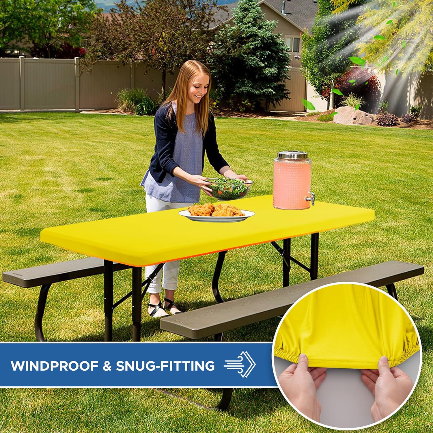Fitted Tablecloth for 8 Foot Rectangle Tables-6 Pack Yellow Elastic Outdoor Picnic Table Cover-Spandex Stretch Folding Table Cloths 8ft for Camping Dining Room Patio Kitchen Banquet Party
