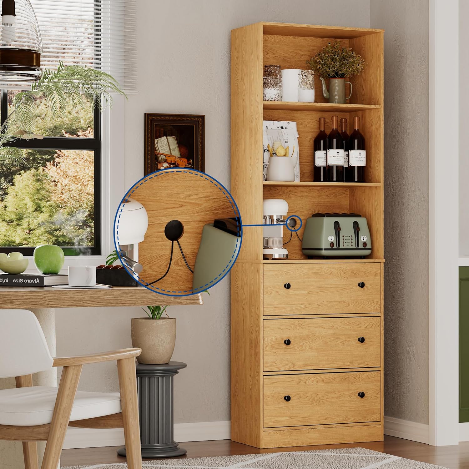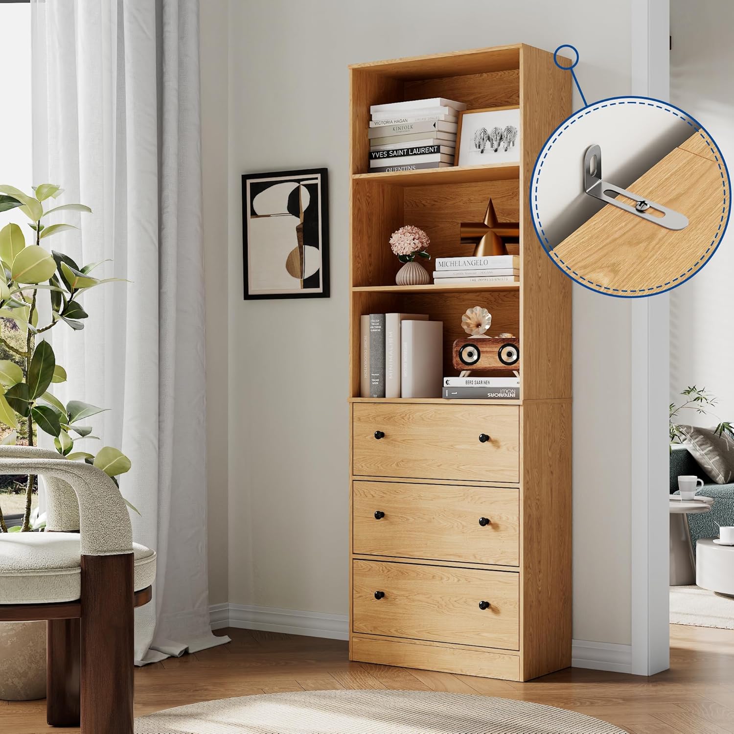 - ă71" Tall Bookcase with 3 Shelves & 3 Drawersă- This book storage shelf stands at 71" tall, providing ample vertical storage with 3 open shelves and 3 built-in drawers. Made from high-quality, waterproof, and scratch-resistant particleboard. The additional anti-tipping iron plate reinforces the tall cabinetâs stability, giving you peace of mind and preventing accidental tipping, especially in homes with children or pets.