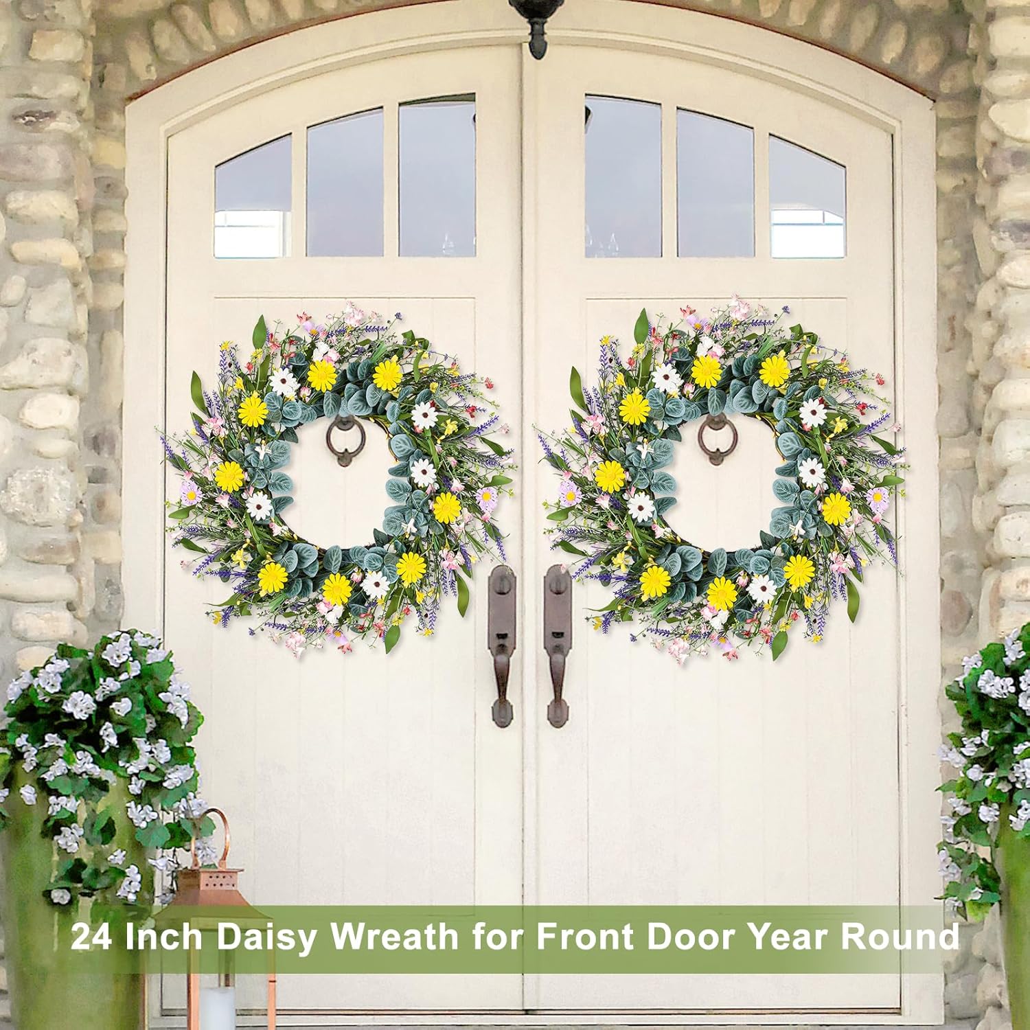 Artgar Spring Wreaths for Front Door, 24 Inch Daisy Wreath, Artificial Spring Summer Wreath with Eucalyptus Leaves Paper Flowers for Indoor Outdoor Home Door Window Wall Wedding Decor