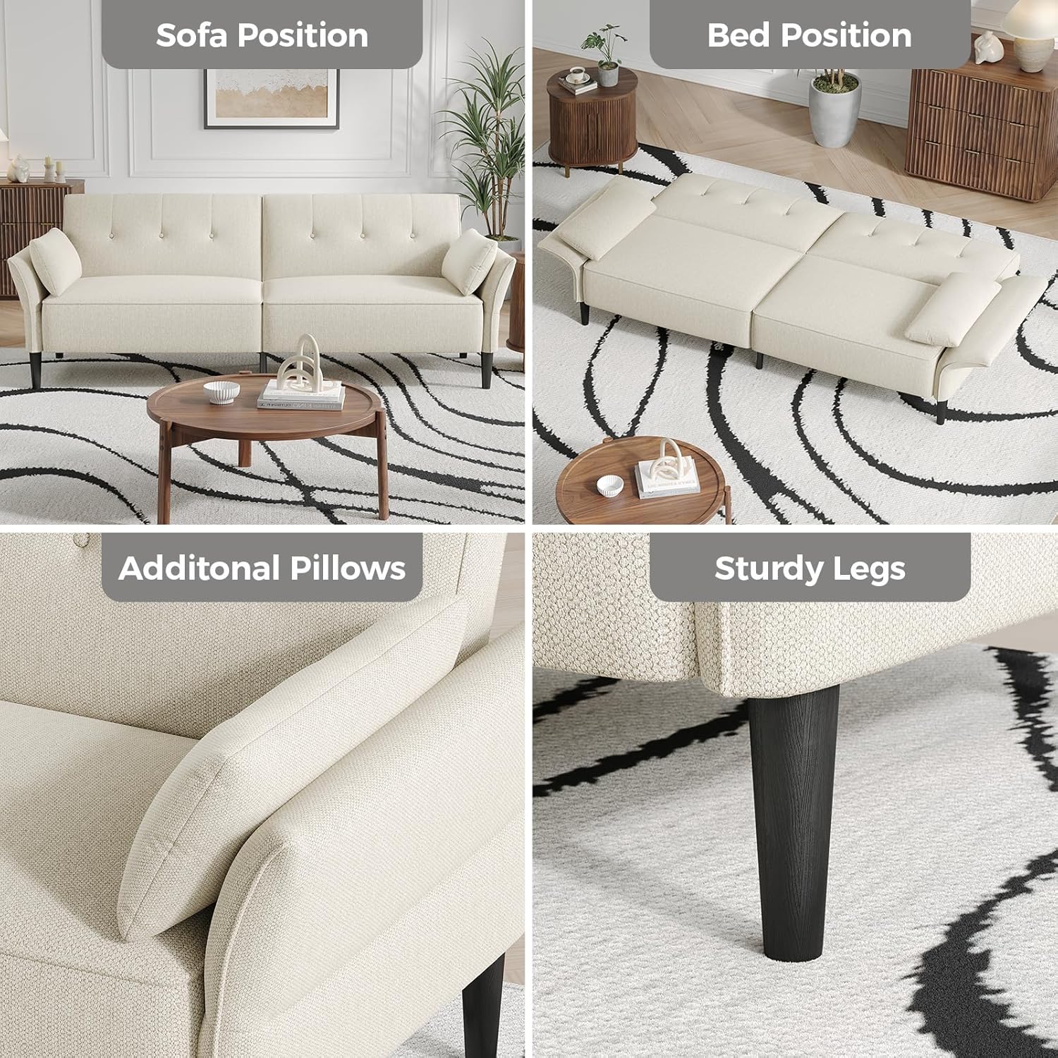 89” Futon Sofa Bed, Linen Comfy Futon Couch Bed with 2 Square Pillows, Convertible Sleeper Sofa with Adjustable Backrest& Armrests, Modern Loveseat Sleeper for Living Room, Bedroom, White