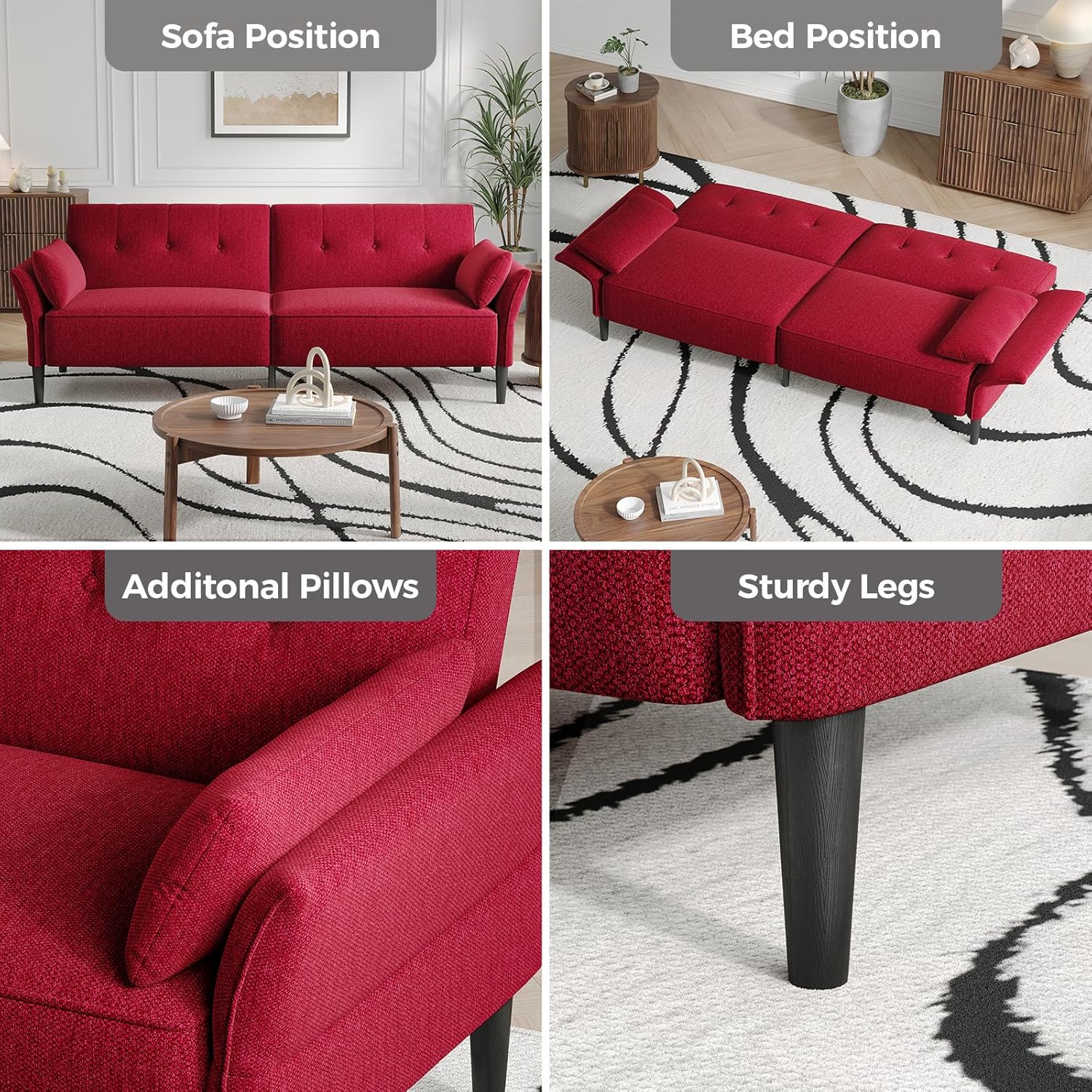 - 【Four-position Adjustable Armrests】Designed in popular styles, this convertible sofa bed is a perfect blend of style and durability. The armrests on both sides can be deployed outward for maximum side lying area, and the maximum deployment angle can be up to 90°. Meanwhile, with the two soft report pillows provided, you can place the pillows at the cervical vertebrae and lumbar region to effectively relieve fatigue