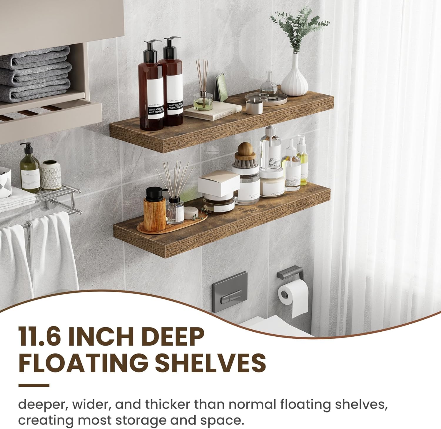 36 Inch Floating Shelves, 12 Inch Deep Floating Shelves for Wall, Floating Shelf with Invisible Brackets, Deep Shelves for Bathroom, Bedroom, Living Room, 2 Pack, Brown