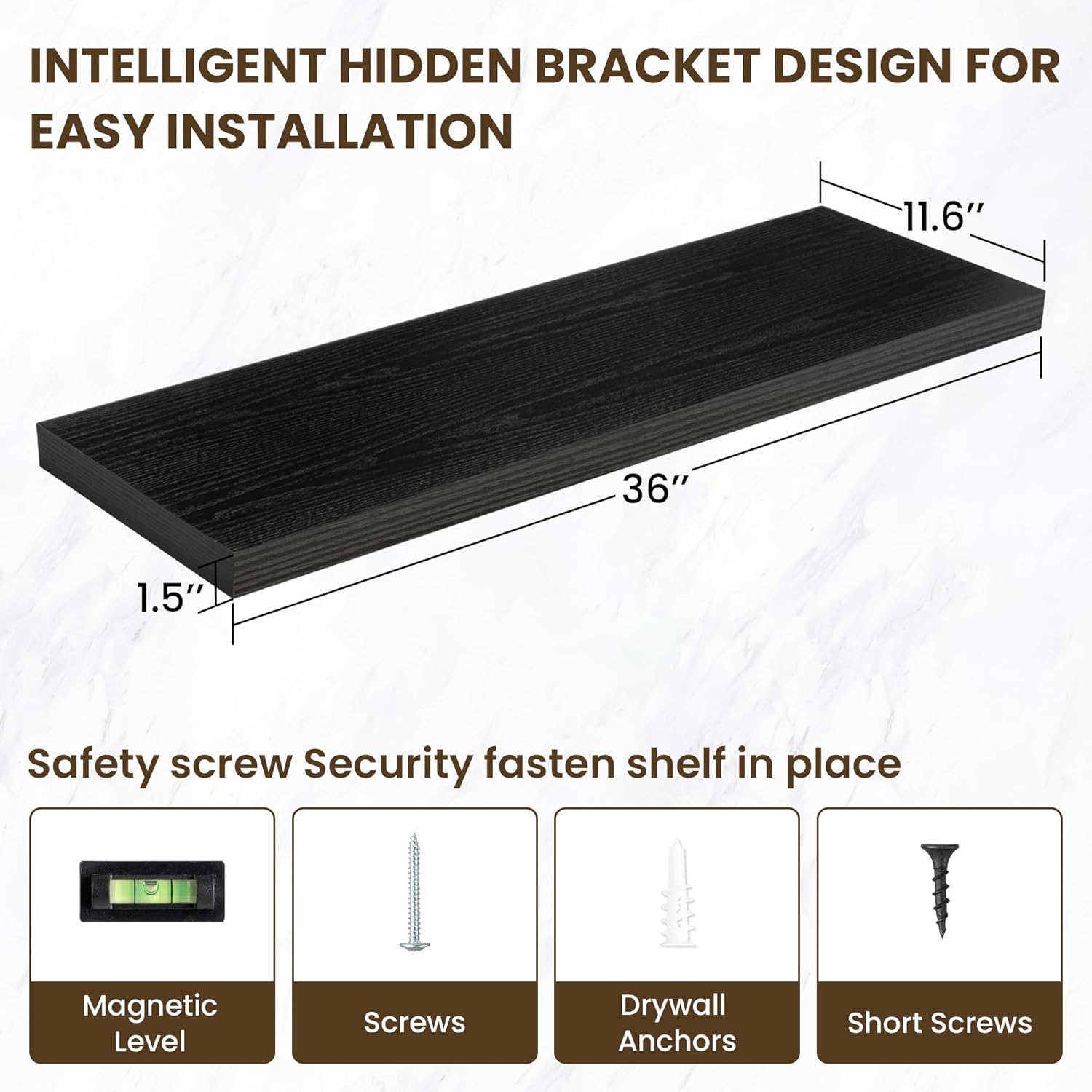 36 Inch Floating Shelves, 12 Inch Deep Floating Shelves for Wall, Floating Shelf with Invisible Brackets, Deep Shelves for Bathroom, Bedroom, Living Room, 2 Pack, Black