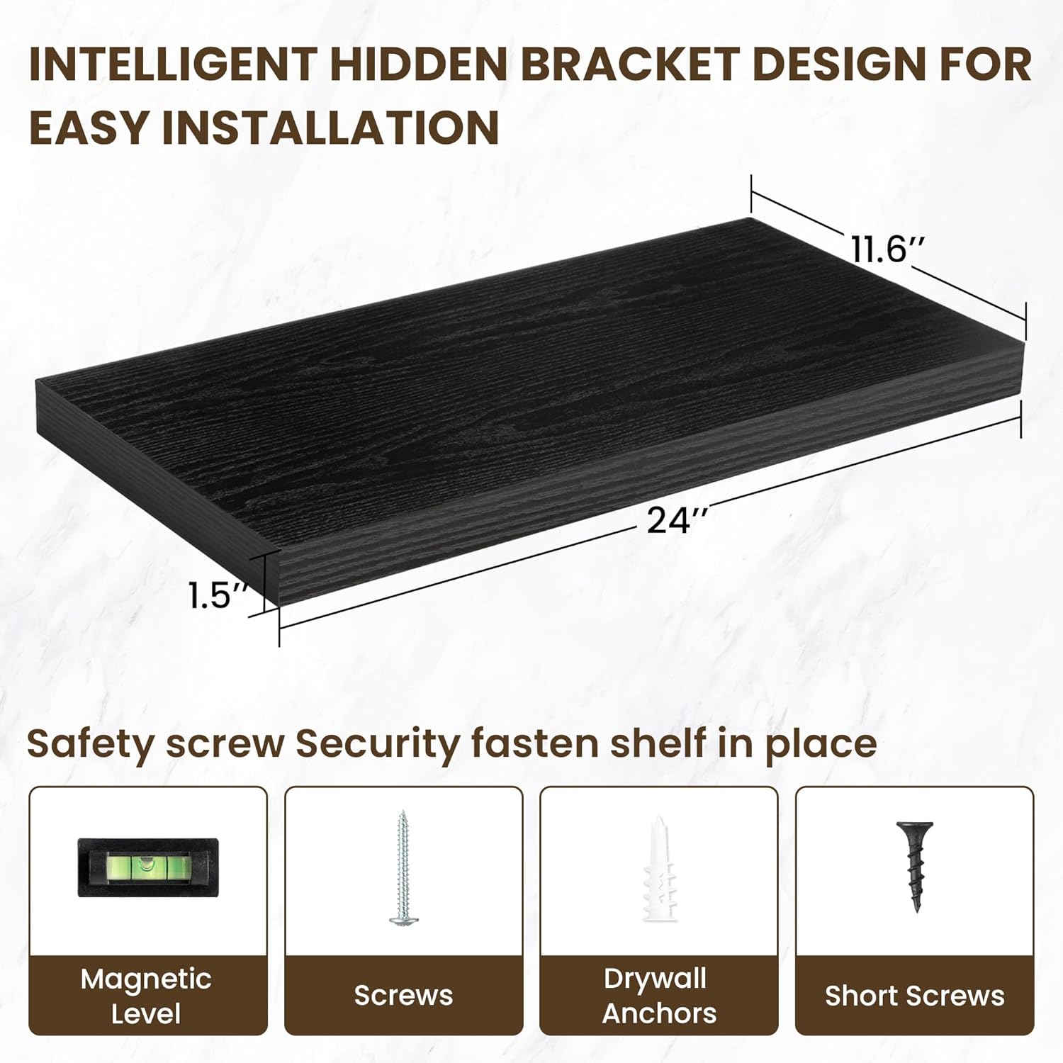 12 Inch Deep Floating Shelves, 24 Inch Long Floating Shelves for Wall, Floating Shelf with Invisible Brackets, Deep Shelves for Bathroom, Bedroom, Living Room, 2 Pack, Black