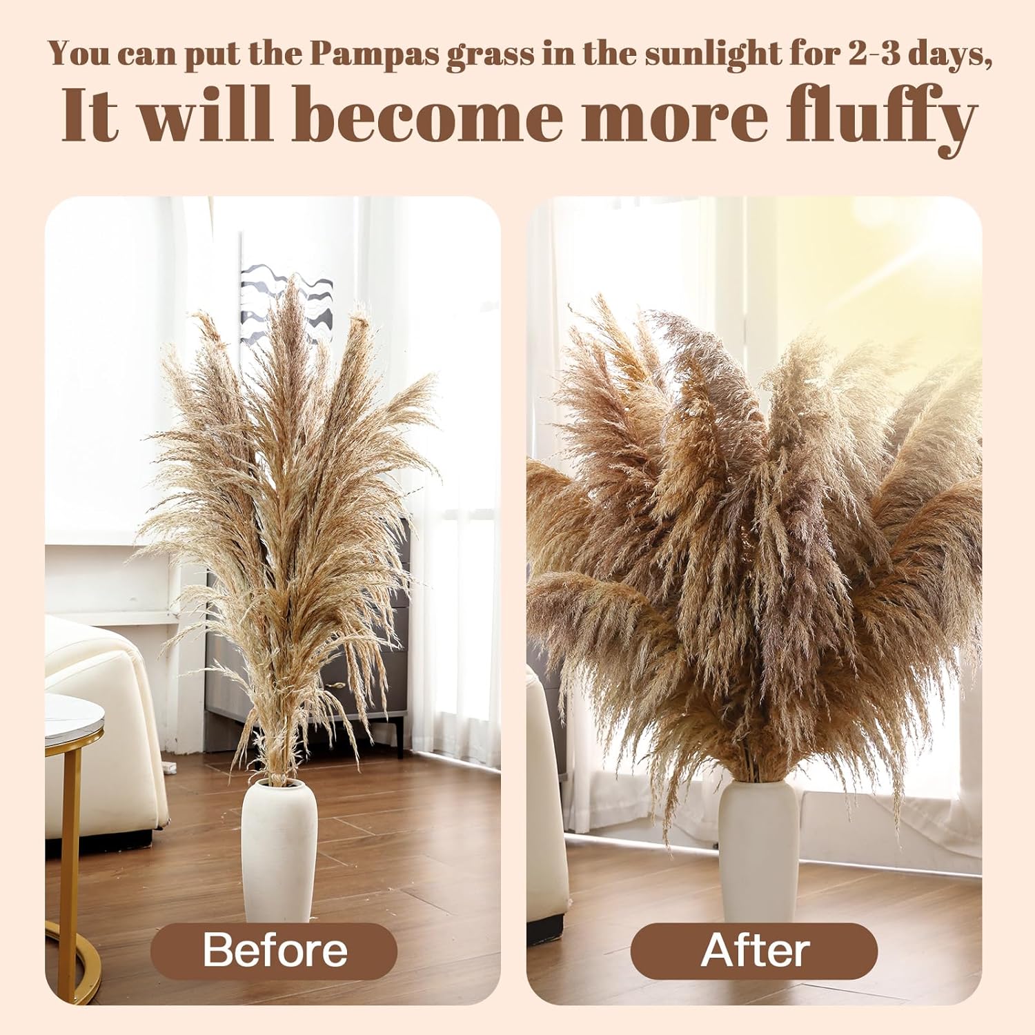 - PAMPAS GRASS DECOR:The color of the tall pampas grass is brown,dried pampas grass is naturally fluffy, beautiful and elegant,you can trim it to the appropriate size and place it in a vase in the sunlight. The brown pampas grass allows them to breathe in the sunshine and breeze, and this true beige color makes boho dried flowers look more fluffy and elegant.Large pampas grass lovely and beautiful.Tall pampas have a boho style and are suitable for boho flowers, event decors,boho wall decor