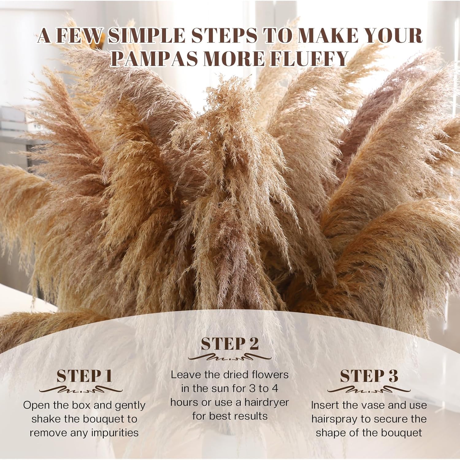 - EASY MAINTENANCE:Pompas grass care is minimal. Shake the stem outdoors to reduce initial shedding. Leave pampass grass in the sunlight for 4 hours to achieve maximum fluffiness, and spray hair gel every six months.dried Pampas grass does not require water. (Do not shake the pompas floral forcefully)