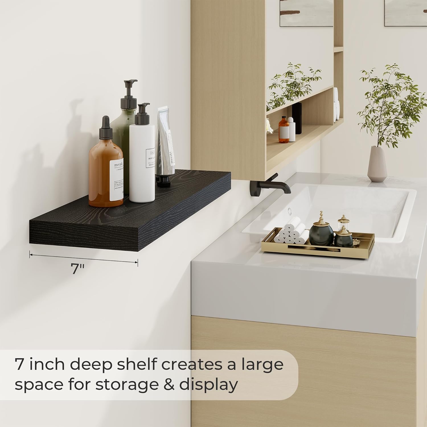 - With extra depth and thickness: This wall-mounted floating shelves measures 24"W x 6.7"D x 1.4"H, featuring an extra-deep and thickened design to maximize storage capacity and support up to 70 lbs. The large floating shelves robust construction allows you to safely display a variety of items, from books to décor. It helps reduce clutter and brings a sleek, modern touch to compact spaces, making it perfect for showcasing your favorite pieces without sacrificing functionality.