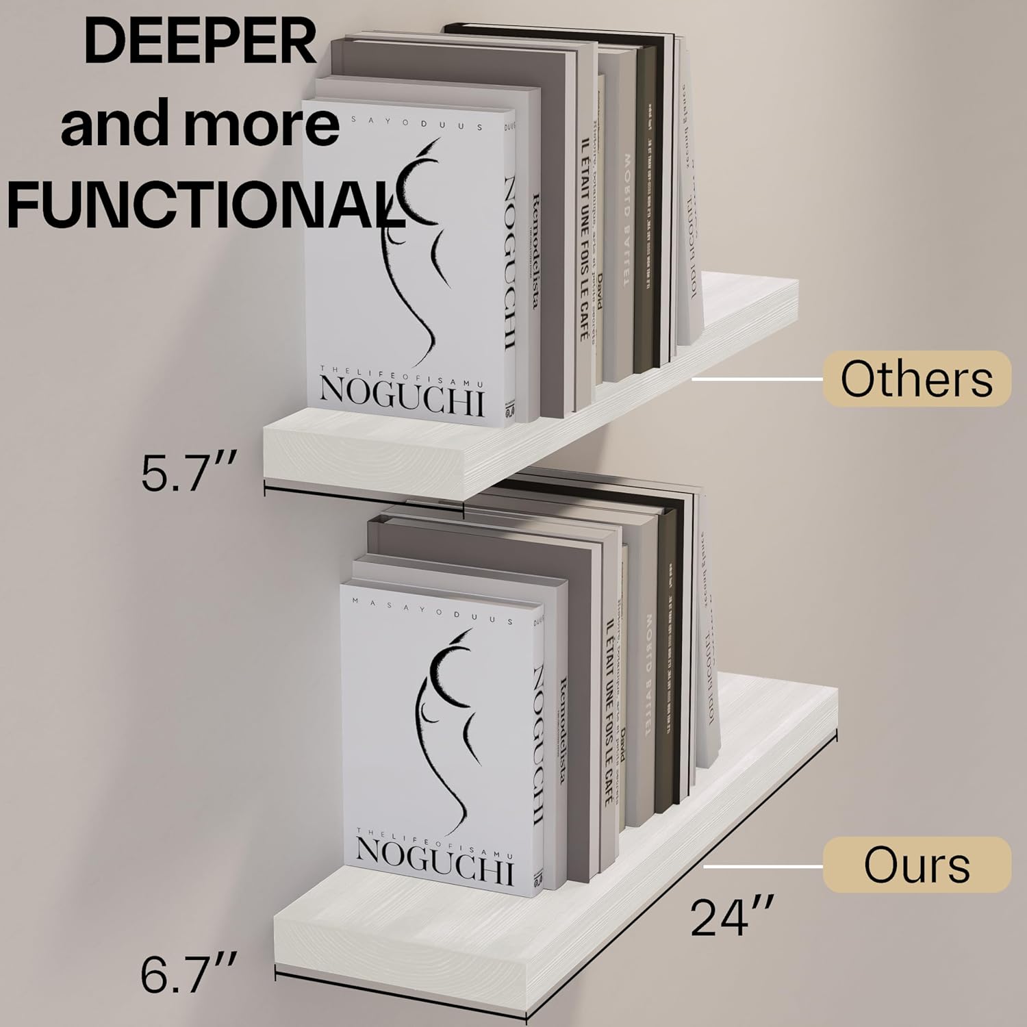 - MODERN RUSTIC LOOK - The 24 inch White floating shelves are made of natural pine, and the wood has different nodes and grains, so the color of each shelf may be slightly different, but equally stunning