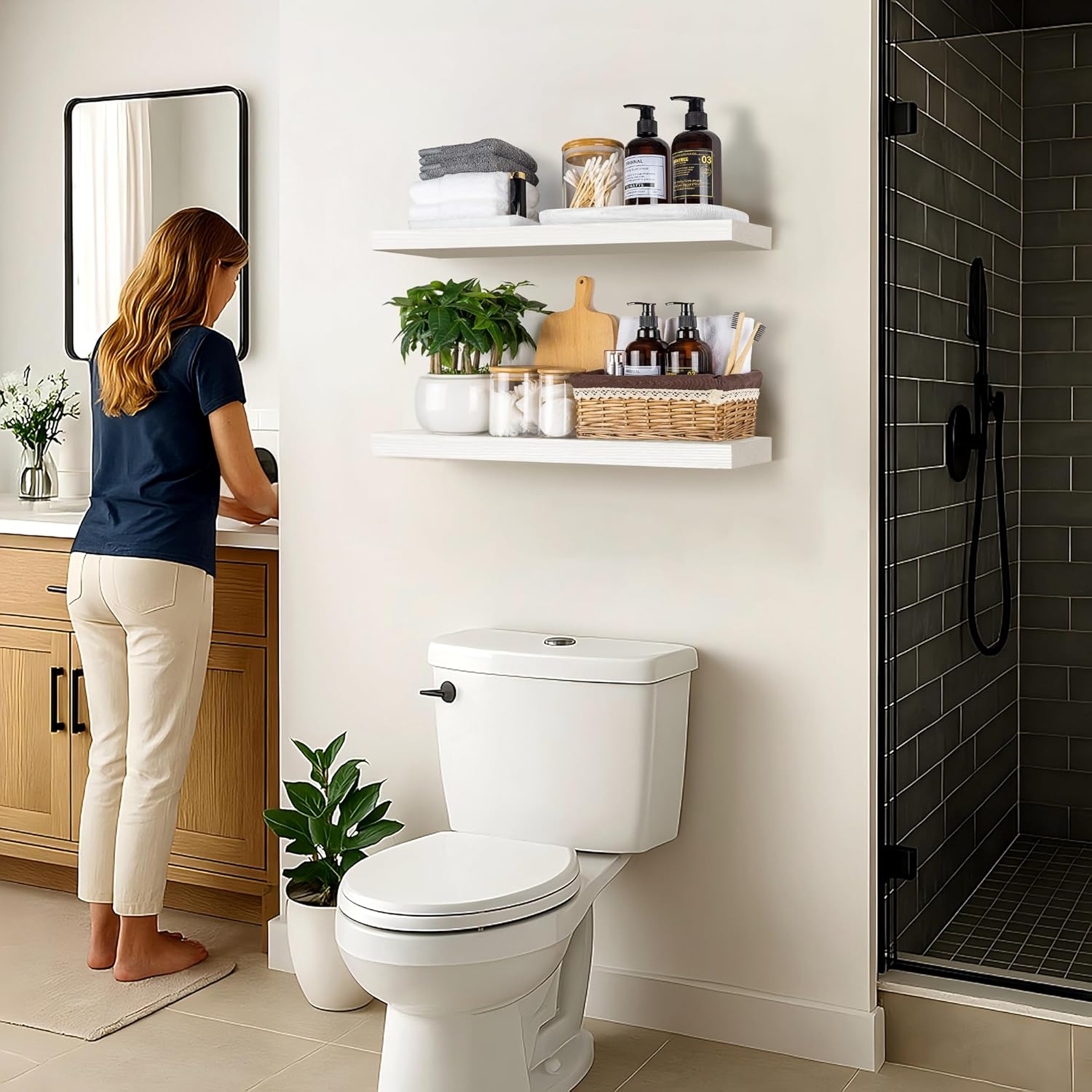 - MULTIFUNCTIONAL DECORATIVE SHELVES: Modern rustic style floating wall shelves are suitable for a variety of scenarios. Use it in the kitchen to store spices, bottles, cups; install it in the bathroom to store shampoo, conditioner, body wash and more. Also perfect for bedroom, living room, office, etc., beautiful and space-saving