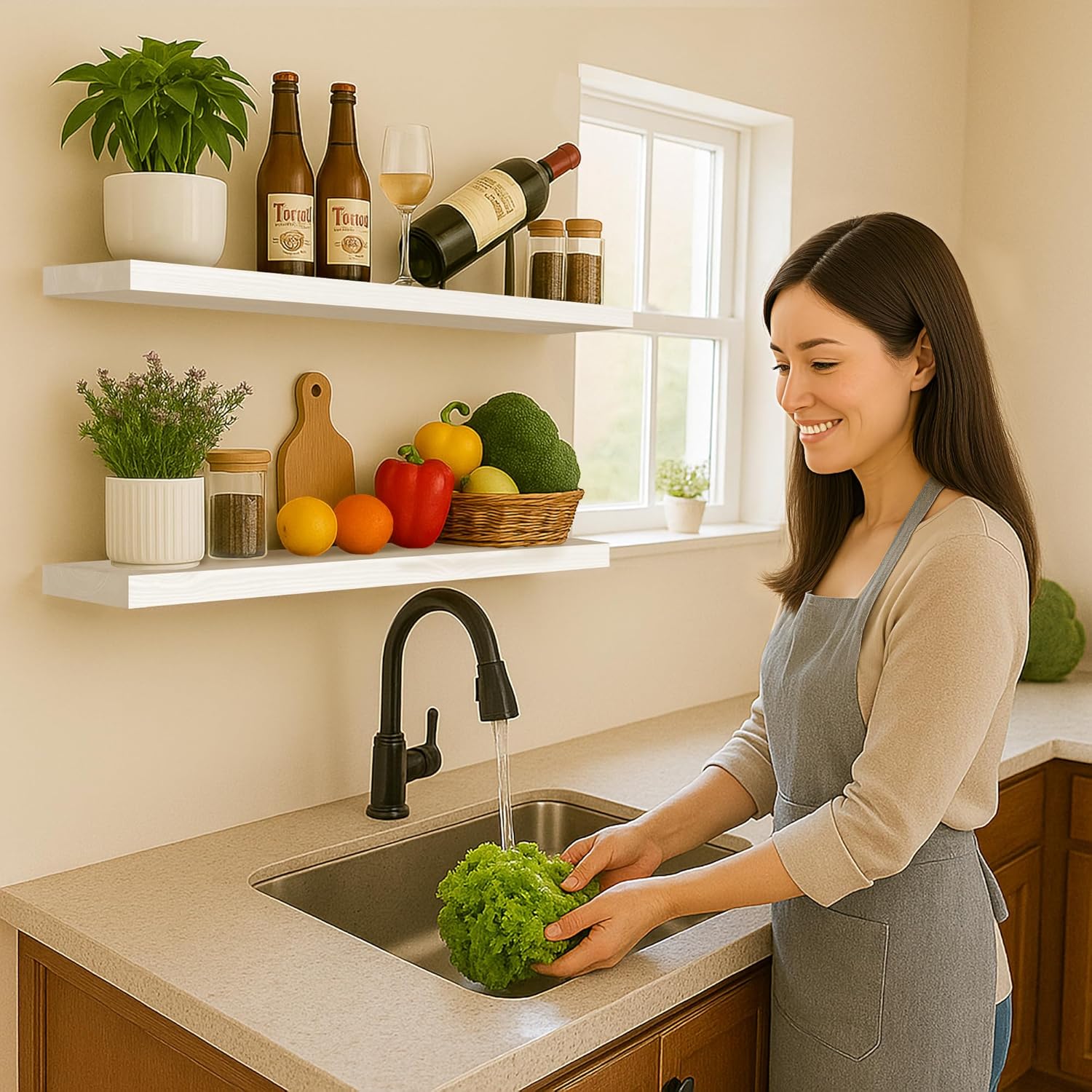 - MULTIFUNCTIONAL DECORATIVE SHELVES: Modern rustic style floating wall shelves are suitable for a variety of scenarios. Use it in the kitchen to store spices, bottles, cups; install it in the bathroom to store shampoo, conditioner, body wash and more. Also perfect for bedroom, living room, office, etc., beautiful and space-saving