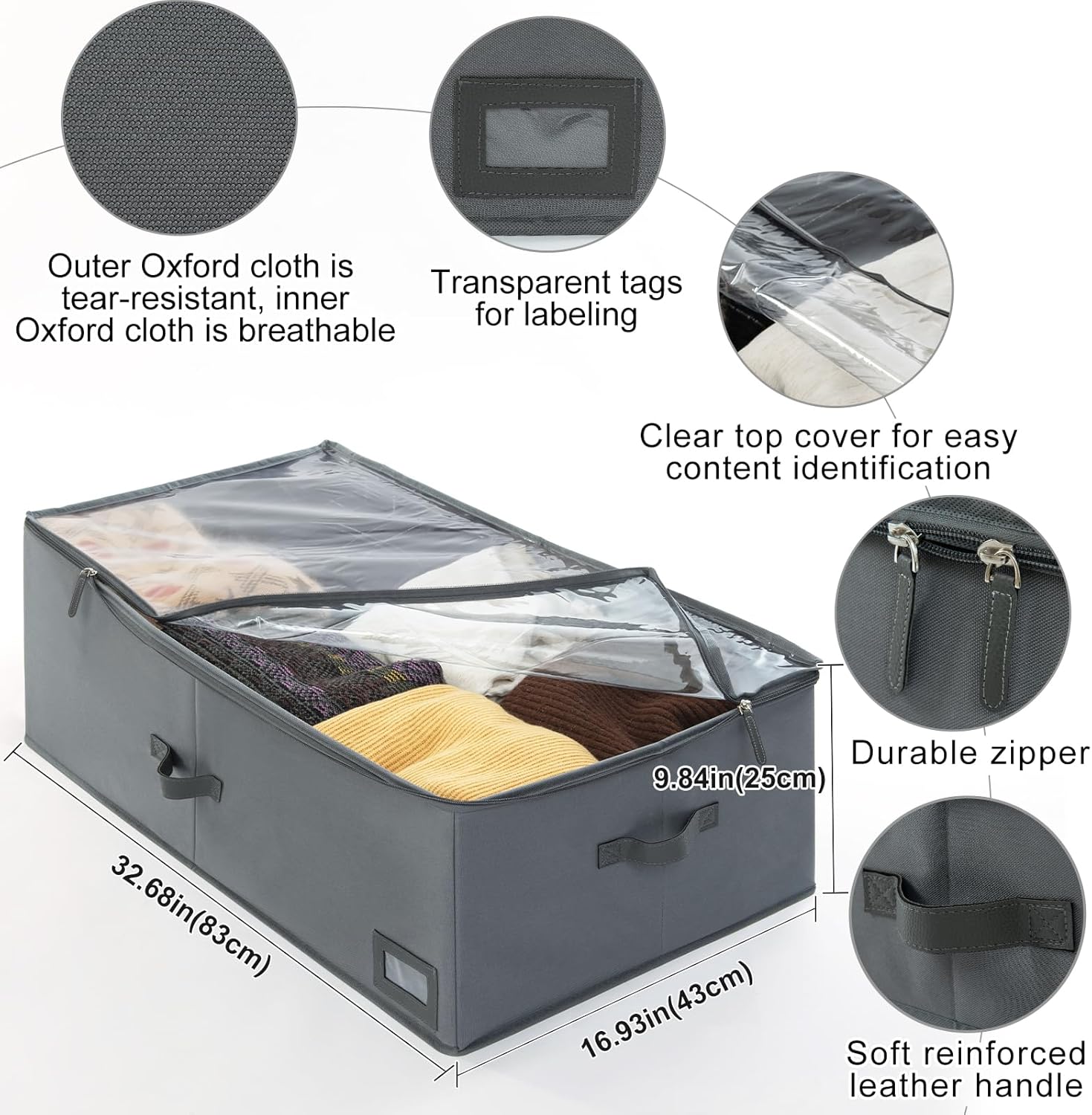 • USER-FRIENDLY DESIGN: This under-bed storage box has a thoughtful design. Despite its low profile, it boasts impressive storage capacity and is easy to assemble. A transparent PVC top window lets you quickly view contents, while a label pocket aids organization for easy access. Its double-zipper design ensures smooth opening/closing, and three handles allow effortless pulling from any direction