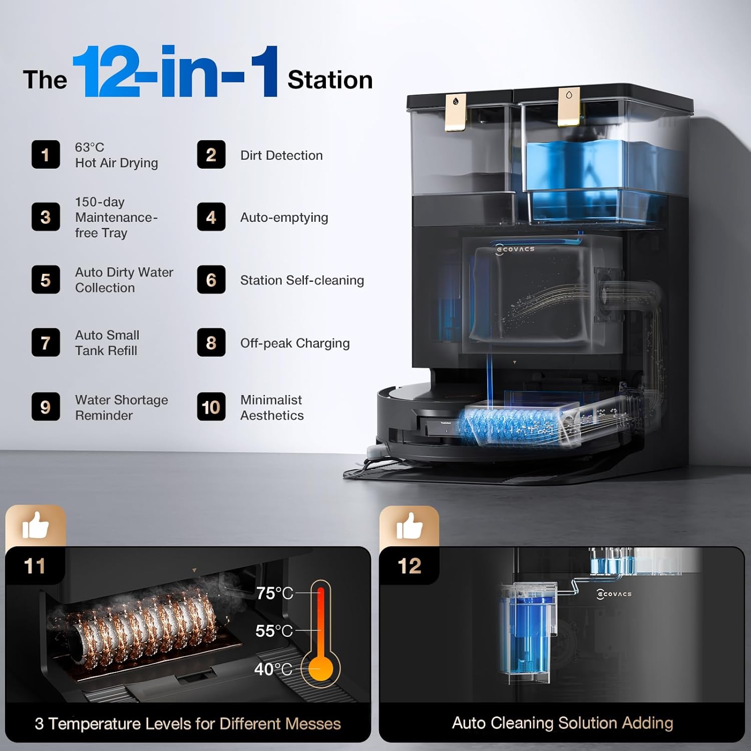 - OMNI STATION - 12-IN-ONE HANDS-FREE CLEANING - The 12-in-One OMNI Station provides truly hands-free cleaning with features like auto-refill, auto-wash, auto-dry, and auto-cleaning solution dispensing—all with hot water to keep the mop fresh for up to 150 days. Simply fill the clean water tank and empty the dirty water tank, and the station takes care of the rest.