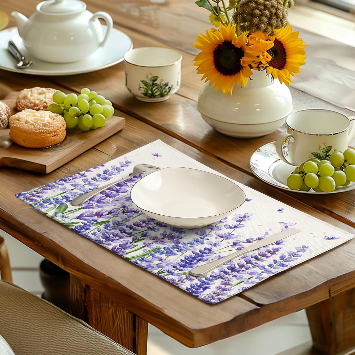 - LINEN FABRIC: Spring summer lavender floral kitchen table mats mainly made of cotton linen, which is soft, durable and wrinkle-proof, will protect your glass or wood table from scratches, spills, food and anything else of the like