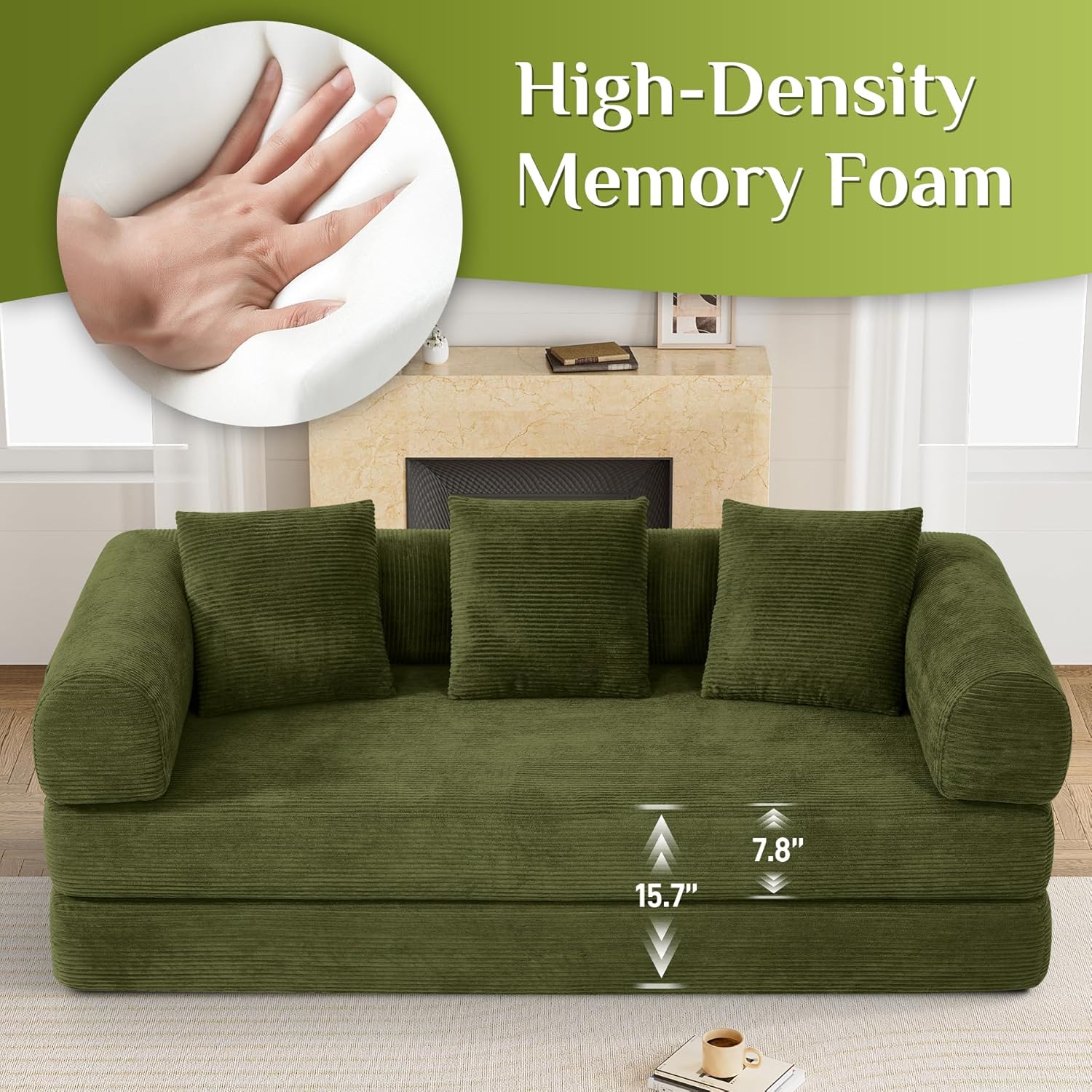 - Damaifrom Convertible Sleeper Sofa Bed:Crafted from soft, breathable pinstripe corduroy and filled with high-density foam, couch bed cushions you while relieving pressure. As a sofa couch bed convertible folding, on the floor couch quickly transforms from a sofa for daily use to a bed for guests. The matching plush pillows enhance comfort, making memory foam couch in a box perfect for any living space.