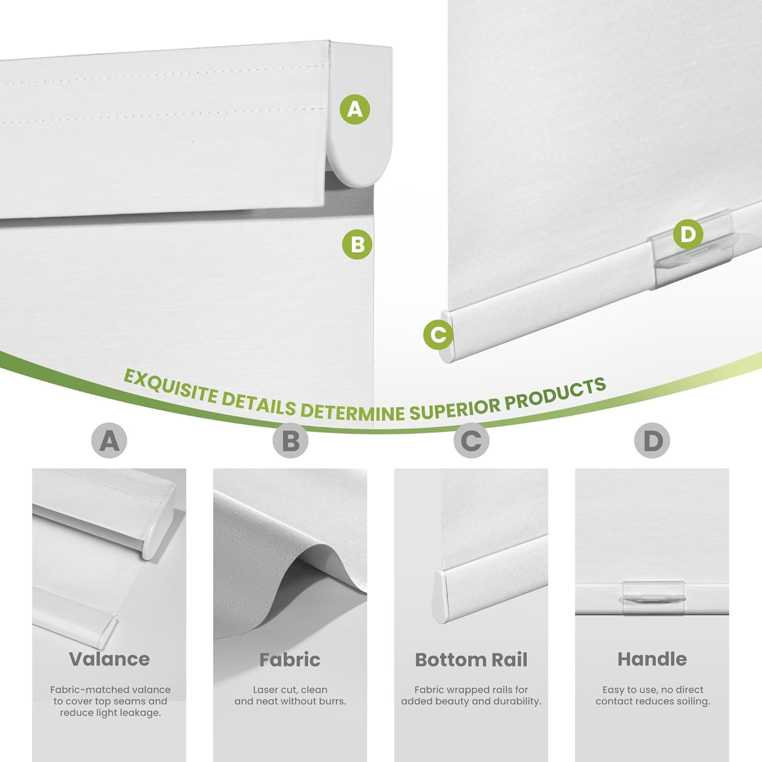 - [Valance Blackout Design, Luxurious and Elegant] Blackout roller shades add an extra layer of hand-stitched valance using fabric to effectively cover the seams of the top rail and reduce light leaks. Give you an excellent light-blocking experience. While the product as a whole using fabric wrapped, uniform color scheme, like a work of art.