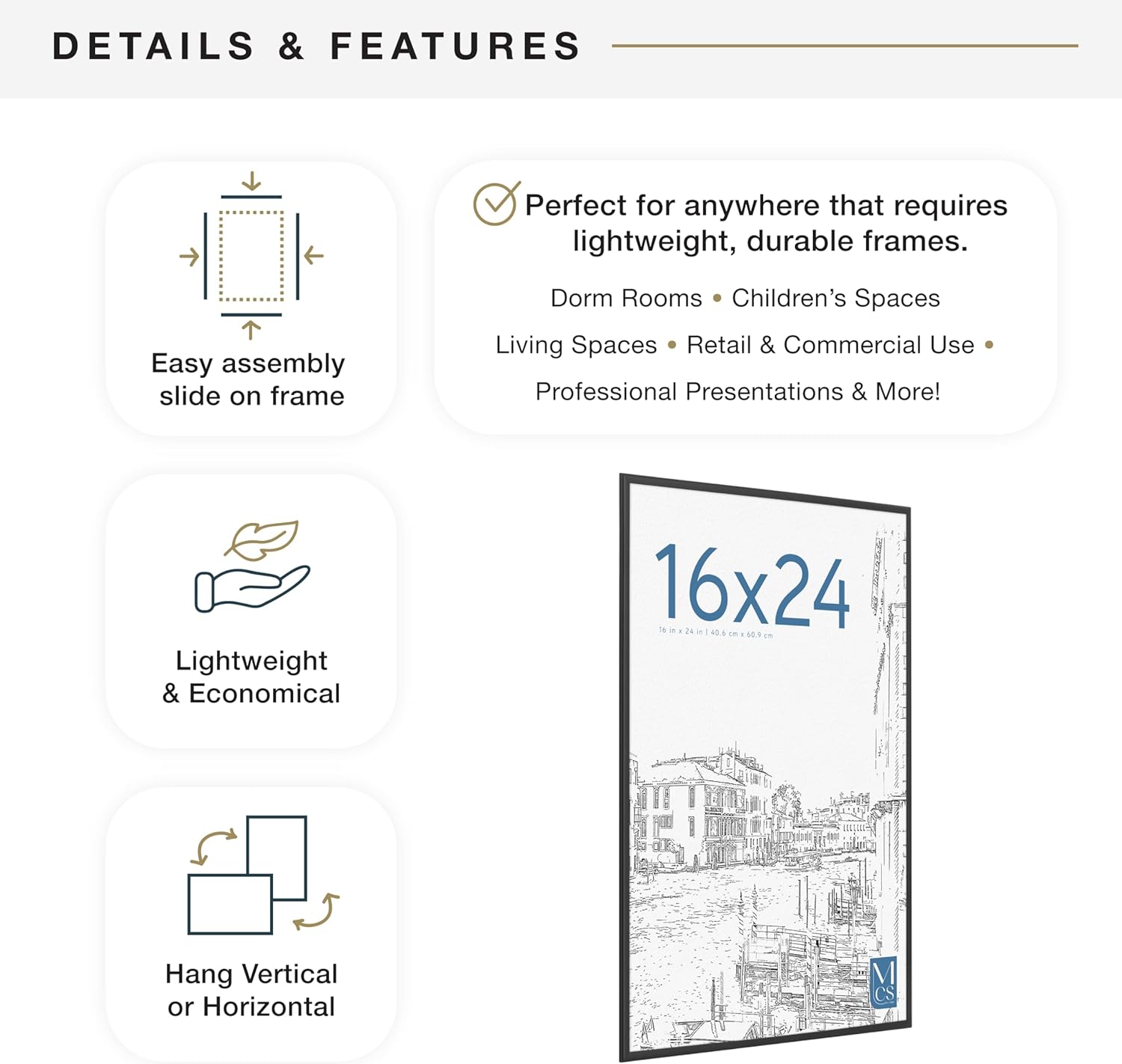 - WALL DECOR: With a passion for design, trend and functionality, MCS delivers best-in-class products that help make your house a home. Use the Original Hanging Poster Frame to create a gallery wall or add a focal point to any room.