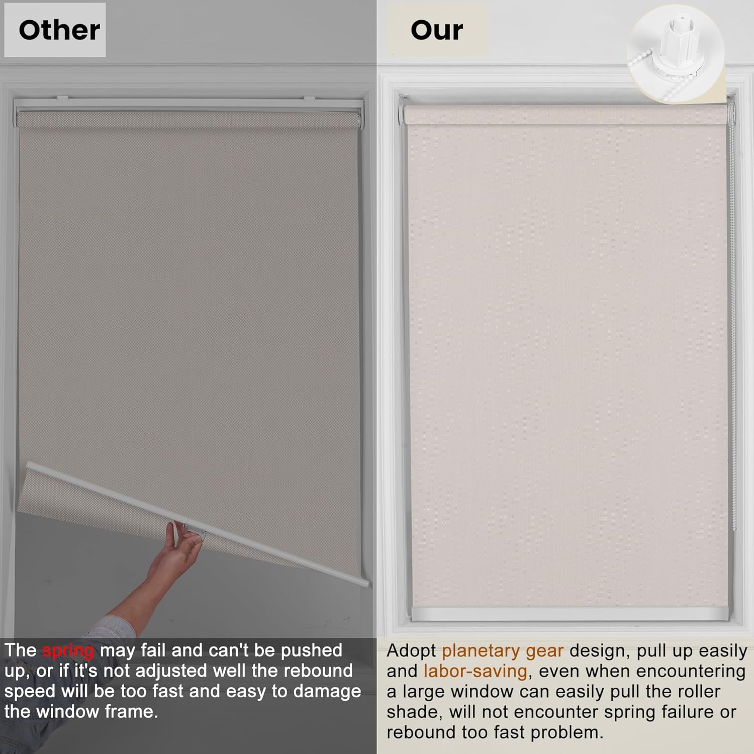 - [Labor-saving Light Filtering Roller Shades] While using labor-saving head with 6 planetary gears, move the shade to let multiple gears drive the main gear at the same time, to achieve the effect of labor-saving. Our roller window shades use ultrasonic cutting process, no raw edges, accurate size, and carefully woven fabric texture allows you to see the view outside scene, also makes the filtered sunlight more gentle, perfect for bedrooms, living rooms, kitchens, French doors and offices