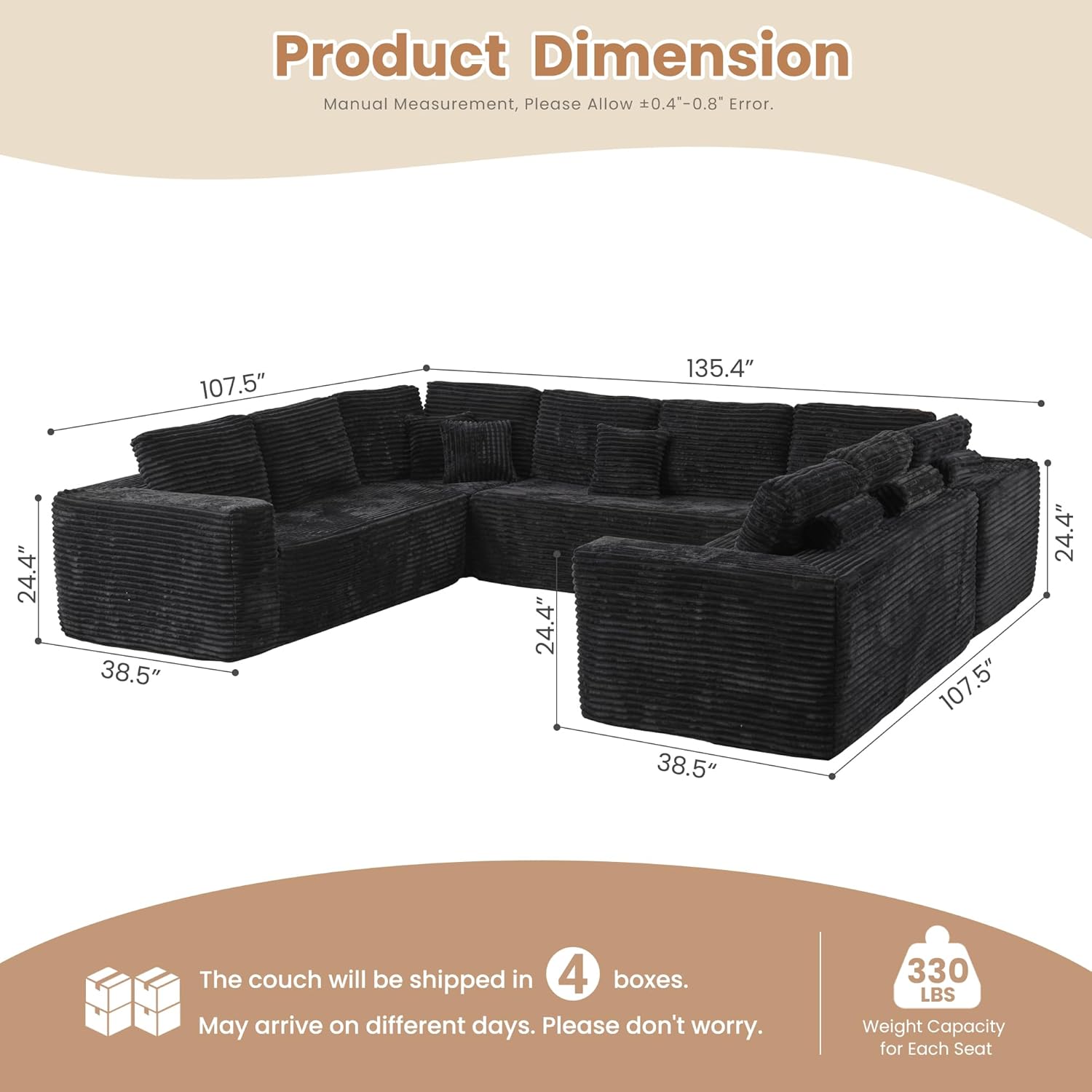 HOOOWOOO Cloud Sectional Couches for Living Room,Modular Sectional Sofa No Assembly,136X110 Inch Plush Corduroy Large U Shaped Floor Couch Set with Deep Seat(Black)