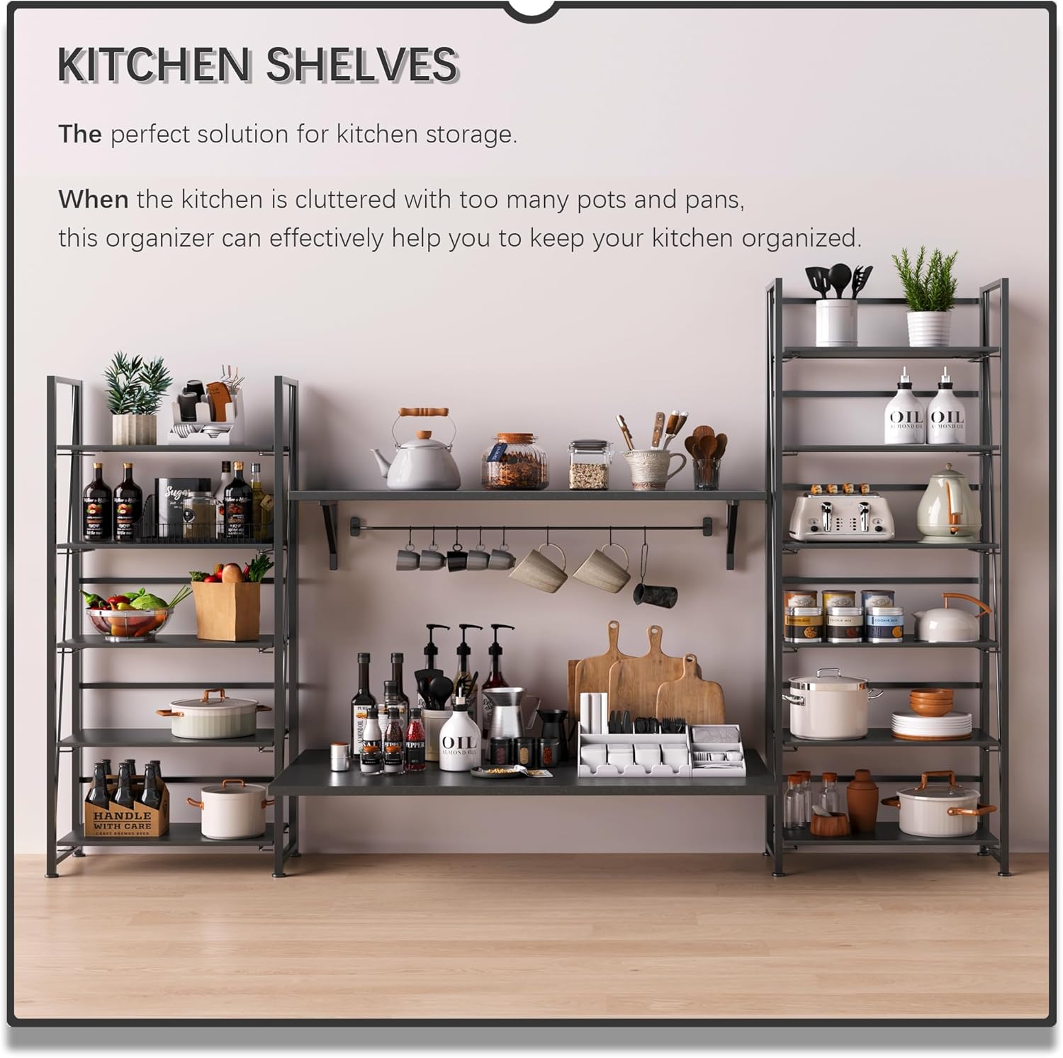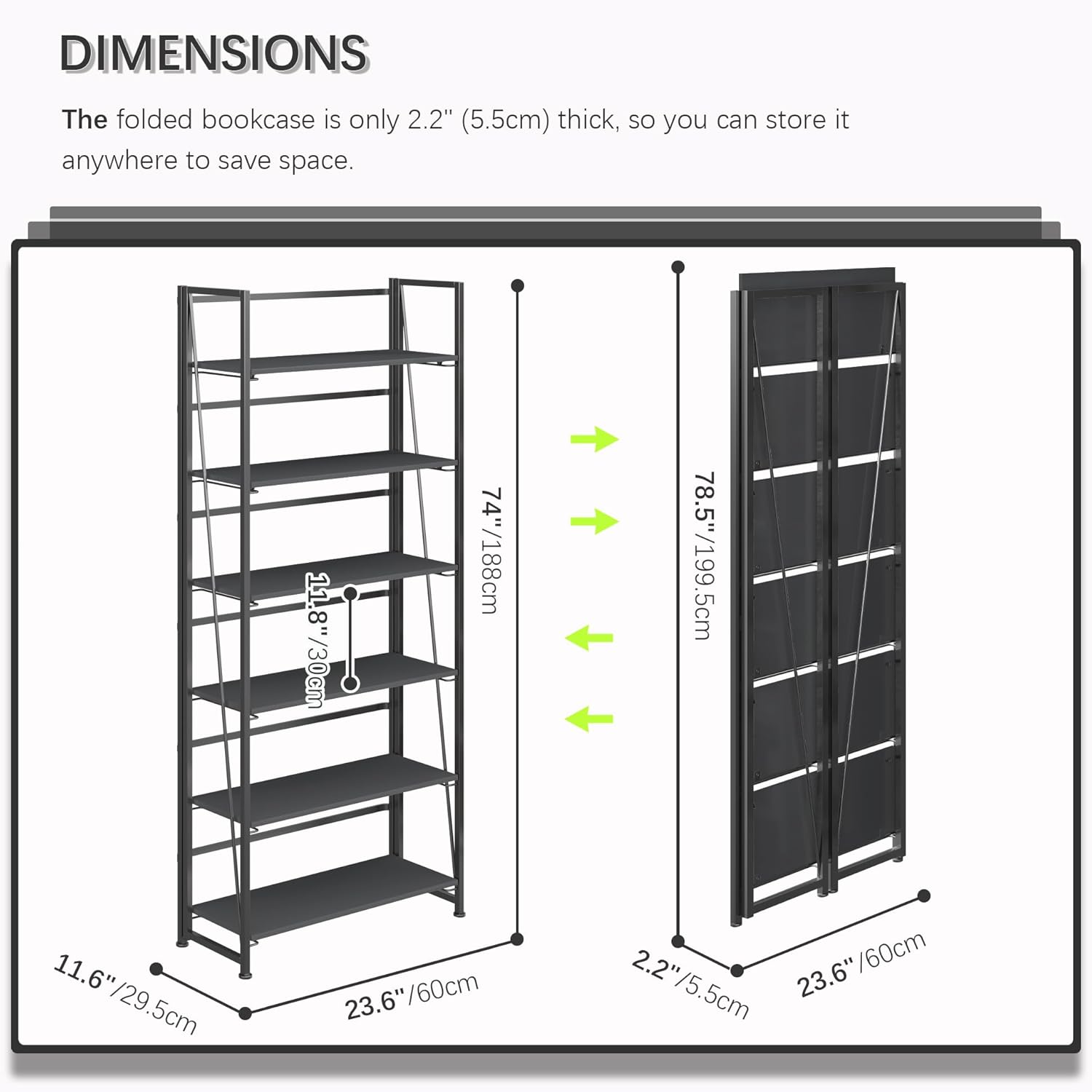 4NM No Assembly Foldable Bookshelf, 6-Shelf Collapsible Bookcase Storage for Small Spaces, 74" H, All Black