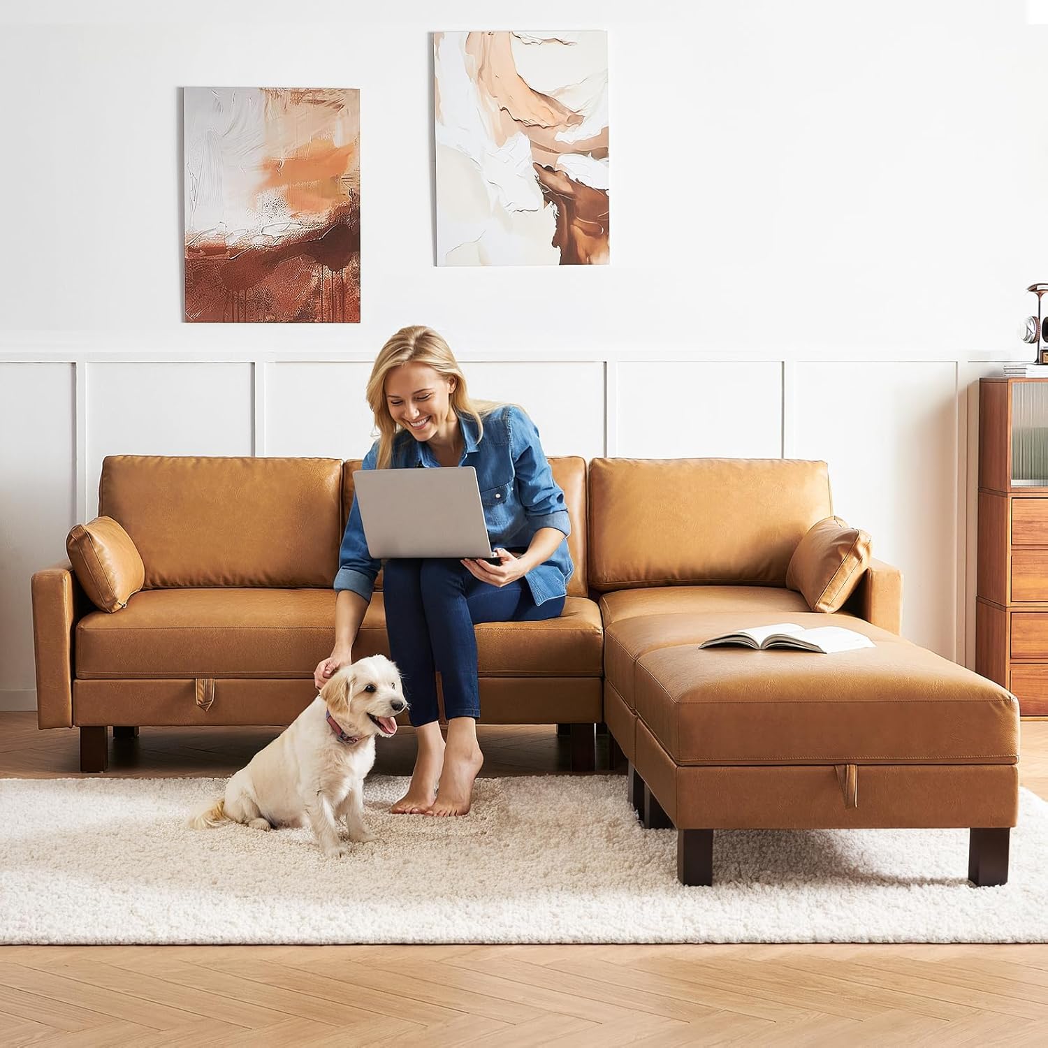 5 Seater Faux Leather Sofa Couch, 98'' L Shape Sectional Couch, Mid Century Modern Decor, Office Sectional Sofa Bed, for House, Apartment, Living Room, Tan