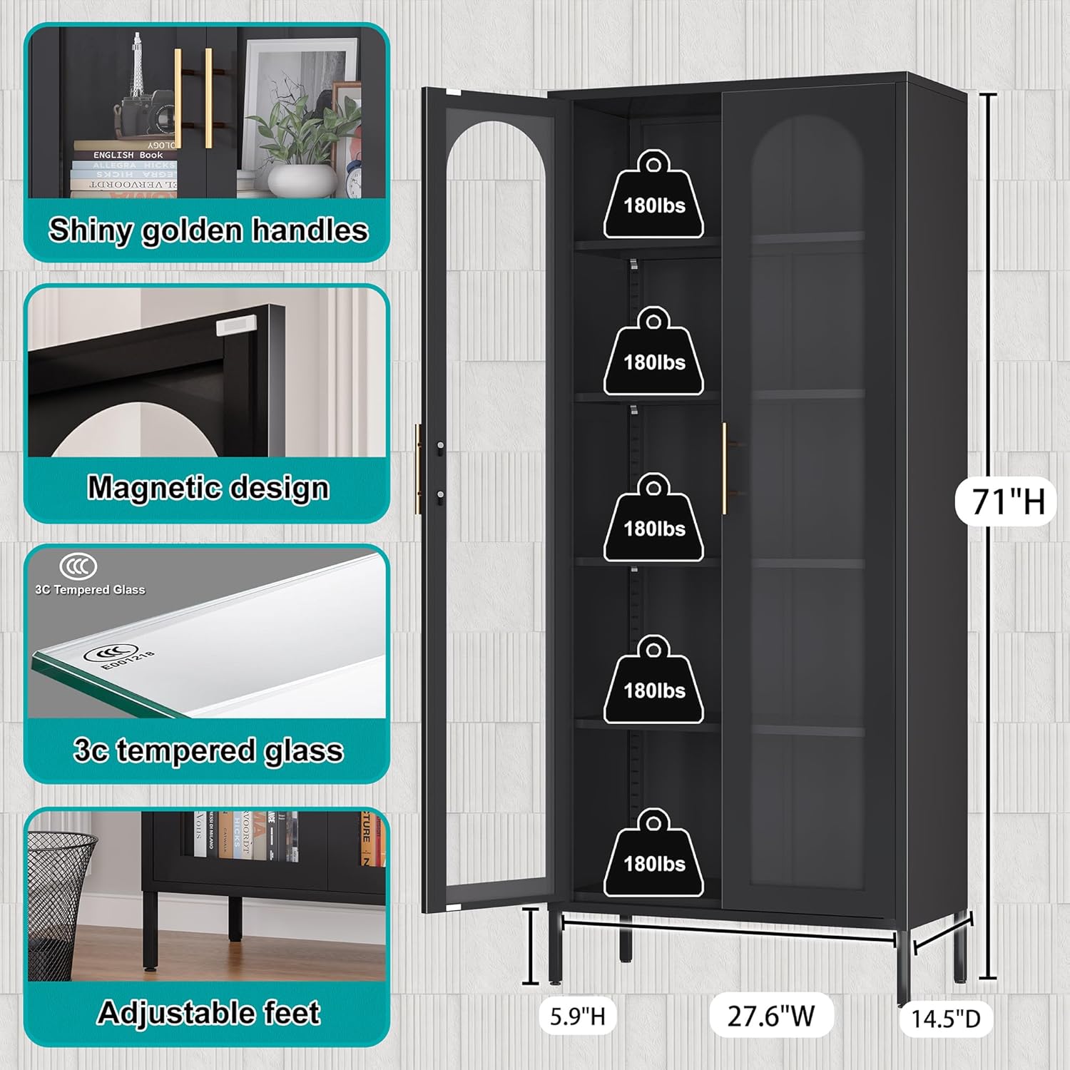 - ăGlass Door BookcaseăThis 71" tall glass cabinet features two upgraded tempered glass doors, providing a clear view of your books and collectibles. The transparent tempered glass allows you to quickly locate your favorite books or display items without opening the doors. The sleek design is complemented by shiny golden door handles, adding a touch of elegance to any room. The glass doors are easy to clean, ensuring your bookcase always looks pristine. An excellent choice for upgrading home and office