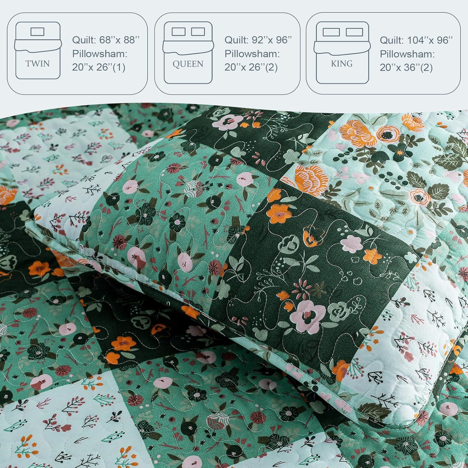 - Design: Pastel green floral patterns are carefully printed on this quilt bedding set. Thanks to the high-tech digital print technology, this bed cover could keep its vibrant colors and patterns from fading after washing