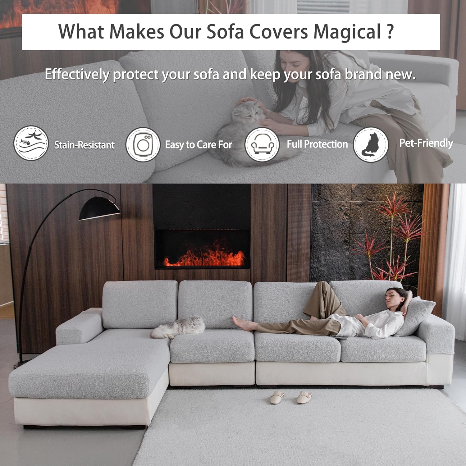 - 5. High-Quality Fabric: The L-shaped couch cover is made of 95% polyester and 5% spandex, which is highly elastic, soft and comfortable, and can be perfectly matched with most furniture. Please note that this sofa cover set does not include the backrest cover and armrest cover, if needed, please order them separately.Note: Due to differences in device displays, actual colors may vary slightly from images.