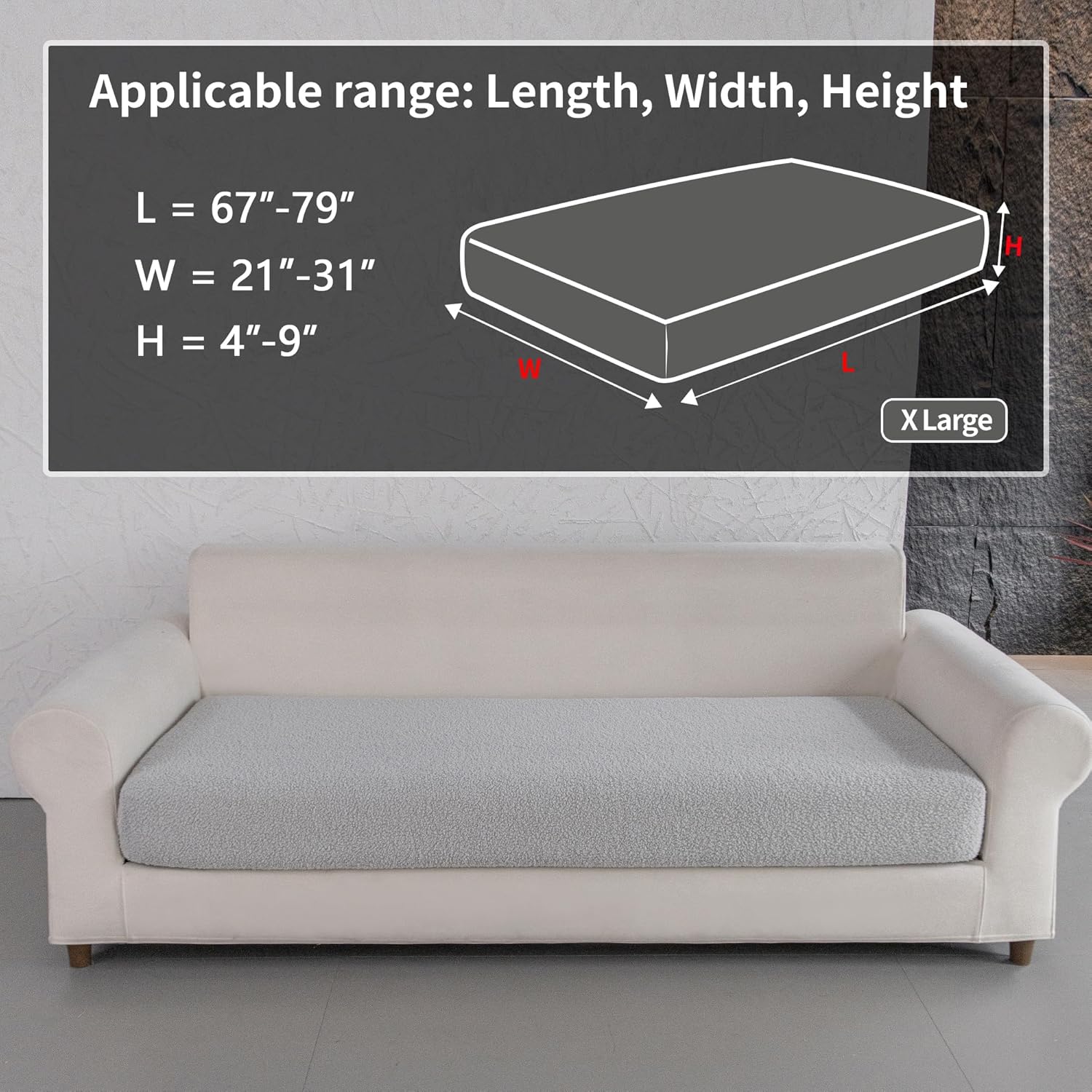 - 1.WHAT YOU WILL GET: 1*Seat Cushion Cover XL. Suitable for sofa cushions with Length: 67-79 inches, Width: 21-31 inches, Height: 4-9 inches.This sectional couch cover is tailor-made for your sofa and can effectively resist stains, dust, pet hair and daily wear and tear.Made of soft Polar Fleece fabric, it adds a cozy and warm touch to your seat.