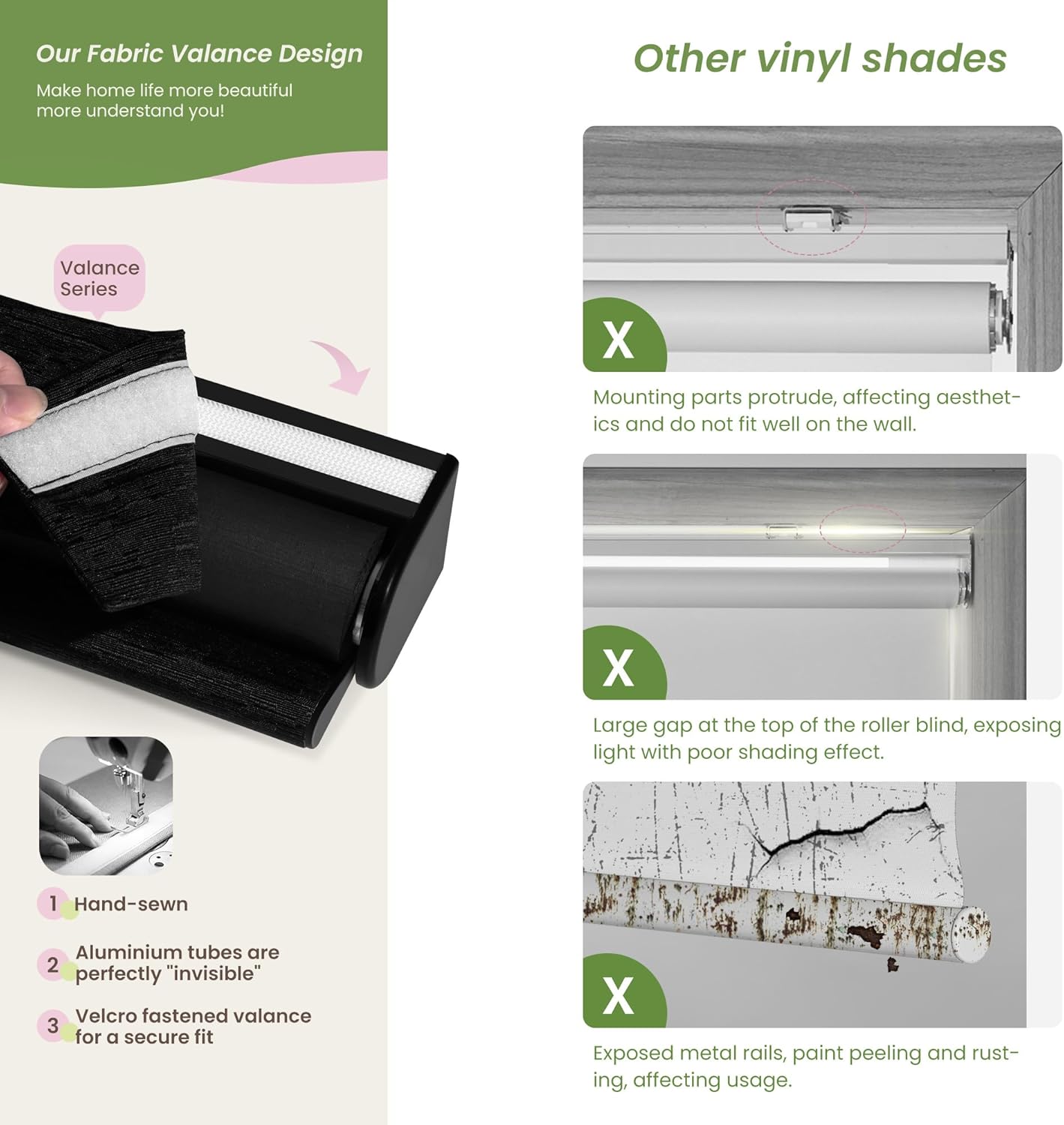 - [Valance Blackout Design, Luxurious and Elegant] Blackout roller shades add an extra layer of hand-stitched valance using fabric to effectively cover the seams of the top rail and reduce light leaks. Give you an excellent light-blocking experience. While the product as a whole using fabric wrapped, uniform color scheme, like a work of art.