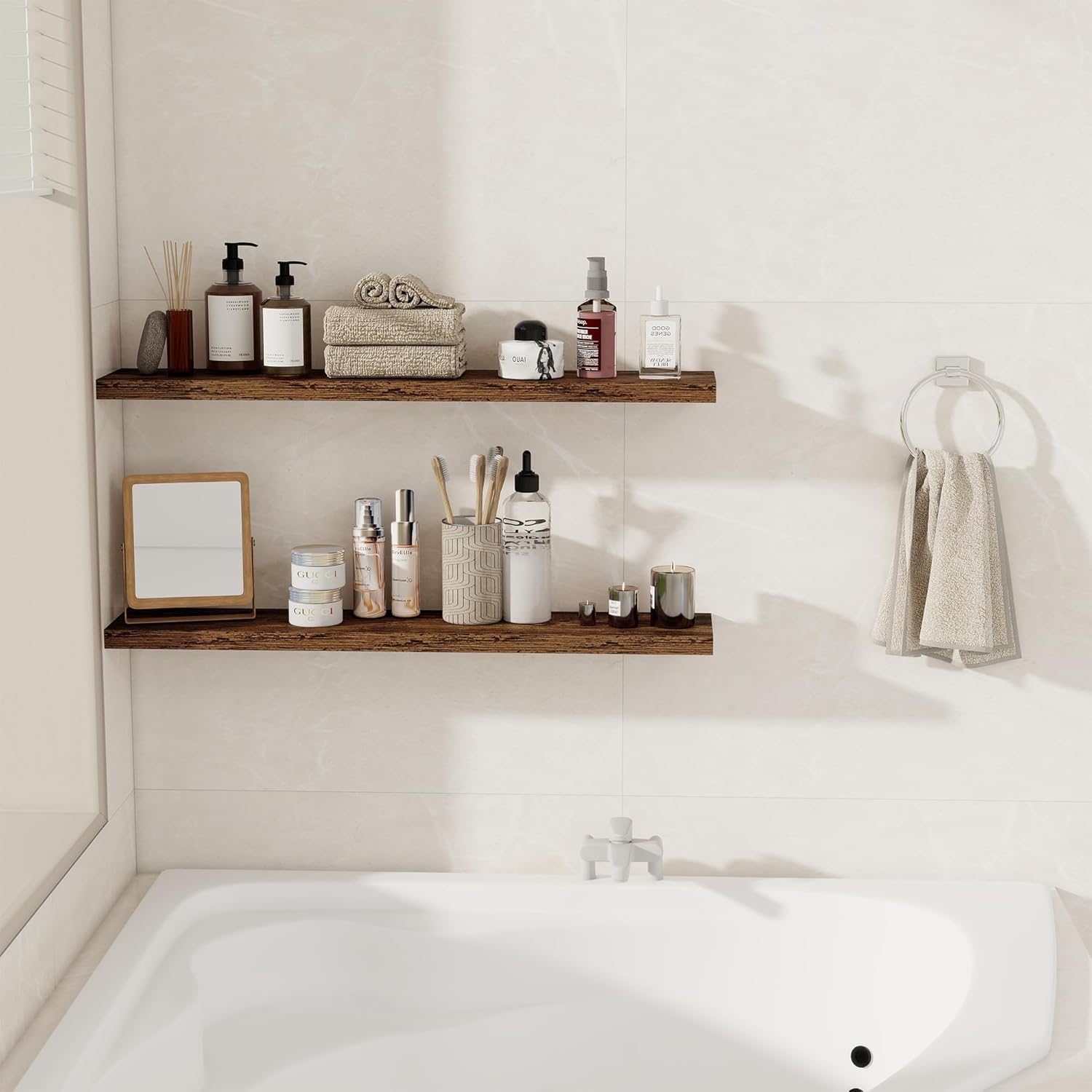 - EASY TO ASSEMBLE: Upgraded hidden mounting bracket aligns ensure a sleek floating effect, making the shelves secure. Instructions, a magnetic level, drywall anchors, and screws are included, making it easy to mount these rustic shelves gap-free in under 8 minutes