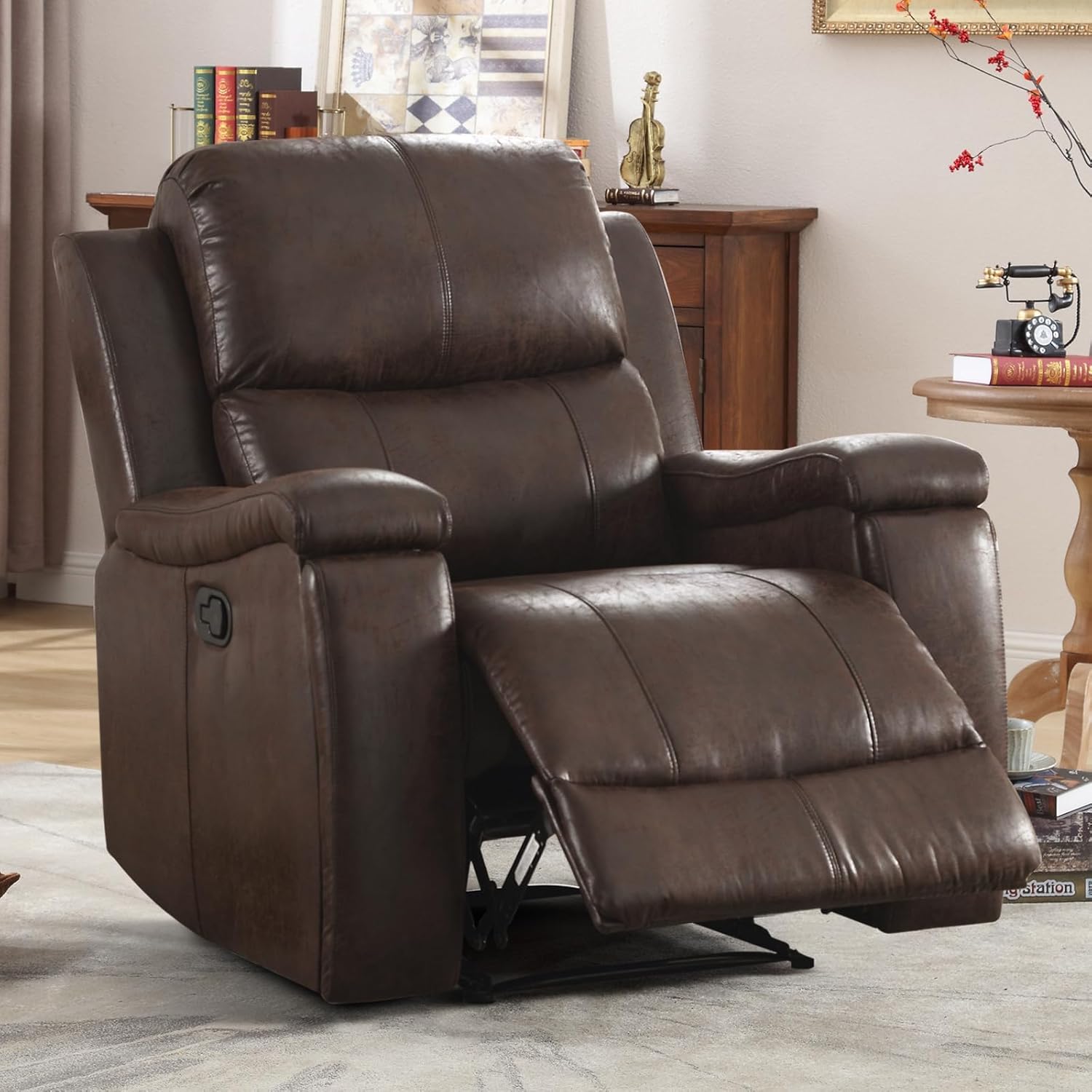 Brown Recliner Chair, Single Overstuffed Sofa Recliners, Breathable Faux Leather Manual Reclining Chairs with Hidden Cup Holder, Arm and Back for Adults, Living Room, Bedroom, Dark Brown