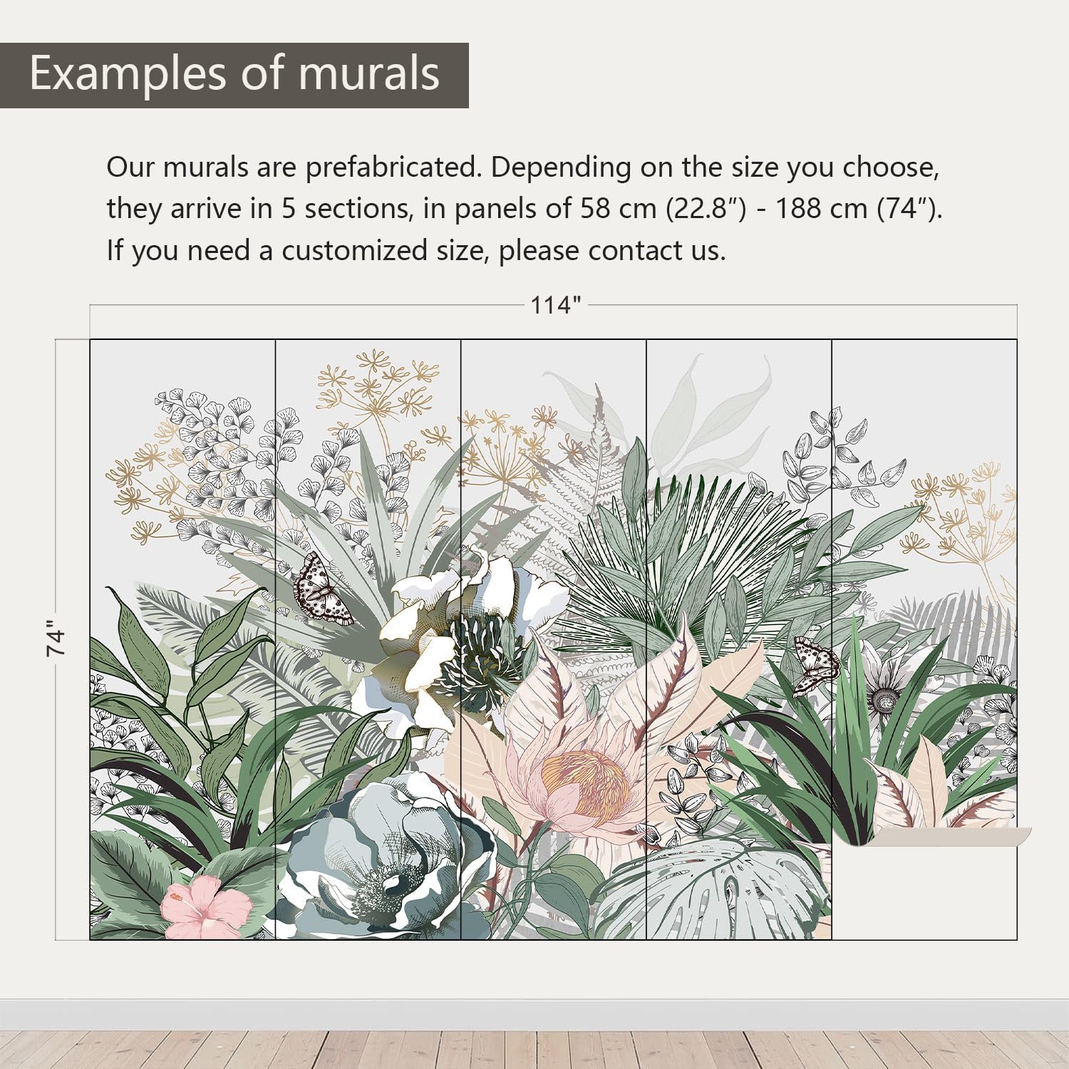 - Size note: Mural measures 114"W x 74"H and is divided into 5 sections, each section is labeled with a number underneath, eliminating the need to overlap patterns when installing.
