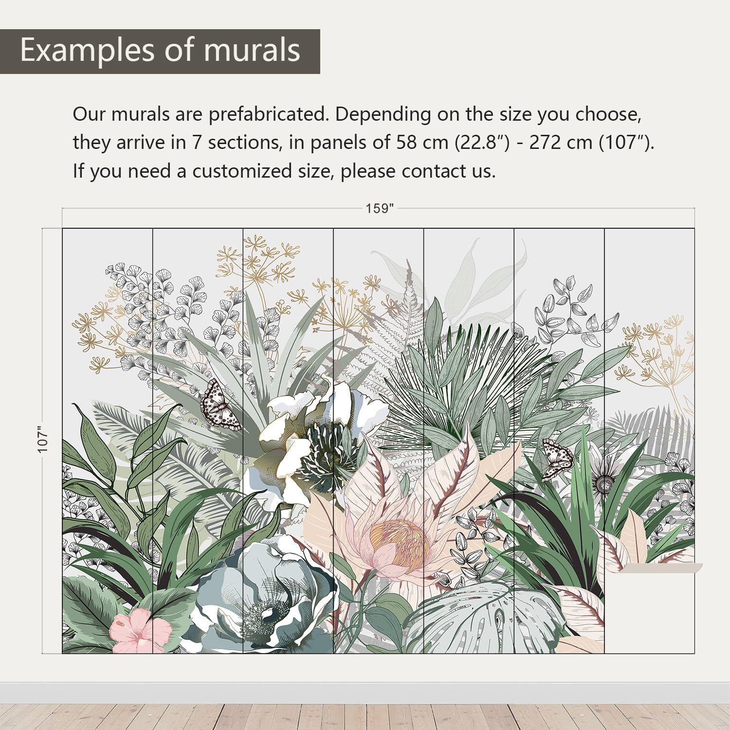 - Size note: Mural measures 159"W x 107"H and is divided into 7 sections, each section is labeled with a number underneath, eliminating the need to overlap patterns when installing.