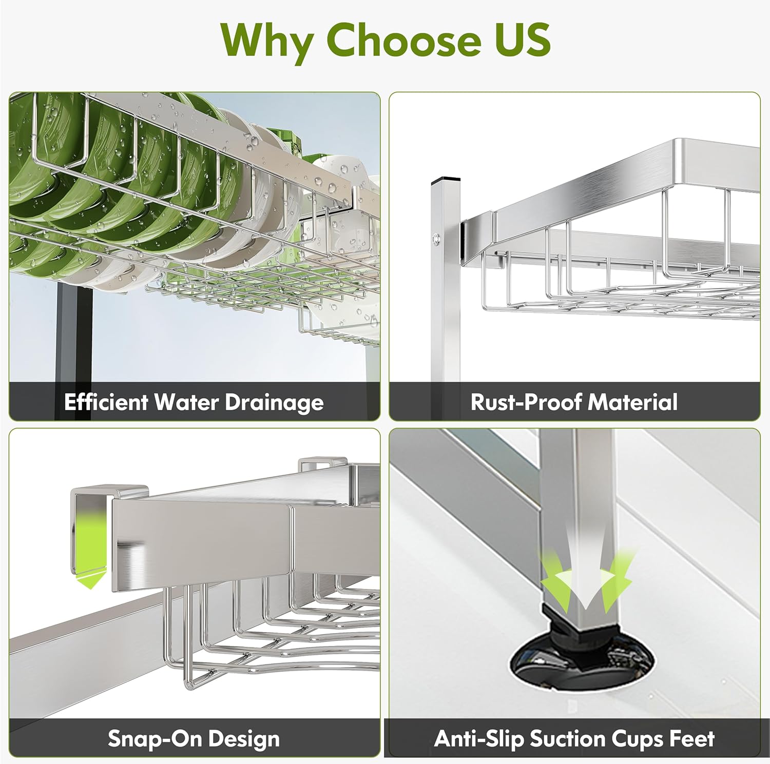 - đź’§ Leak Free Water Management: Flat, level shelves let gravity channel drips directly into the sink, eliminating puddles on countertops. The kitchen dish drying rack rust proof grid prevents water pooling, while smooth edges protect dishes from scratches. Wipe clean with a cloth, no disassembly needed for routine maintenance