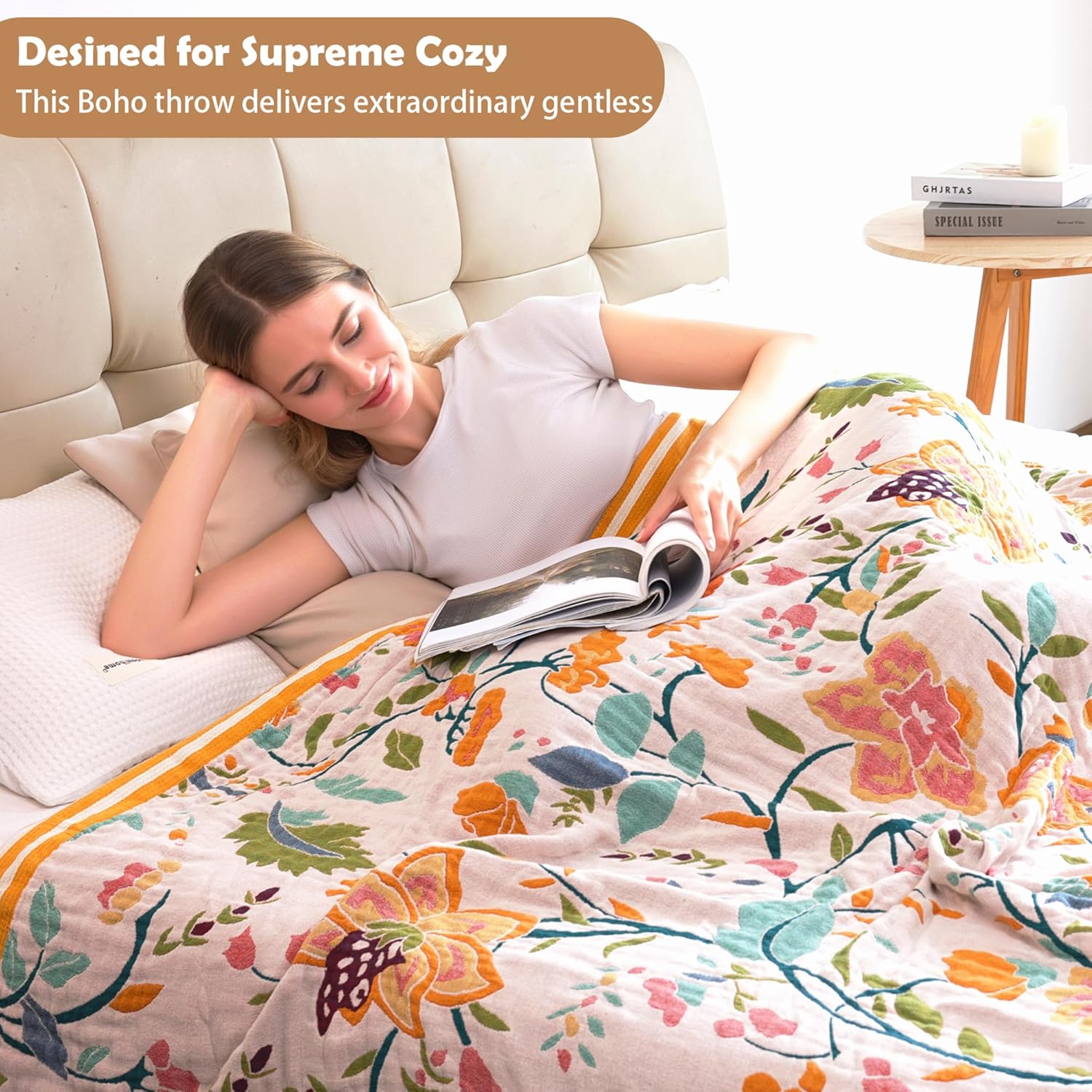 Boho Throw Blanket, 100% Organic Cotton Breathable Ultra Soft 80" x 90" Bed Quilt Throw - All Season Floral Rustic Farmhouse Decor Luxury Reversible Blanket for Sofa Couch Chair and Gift