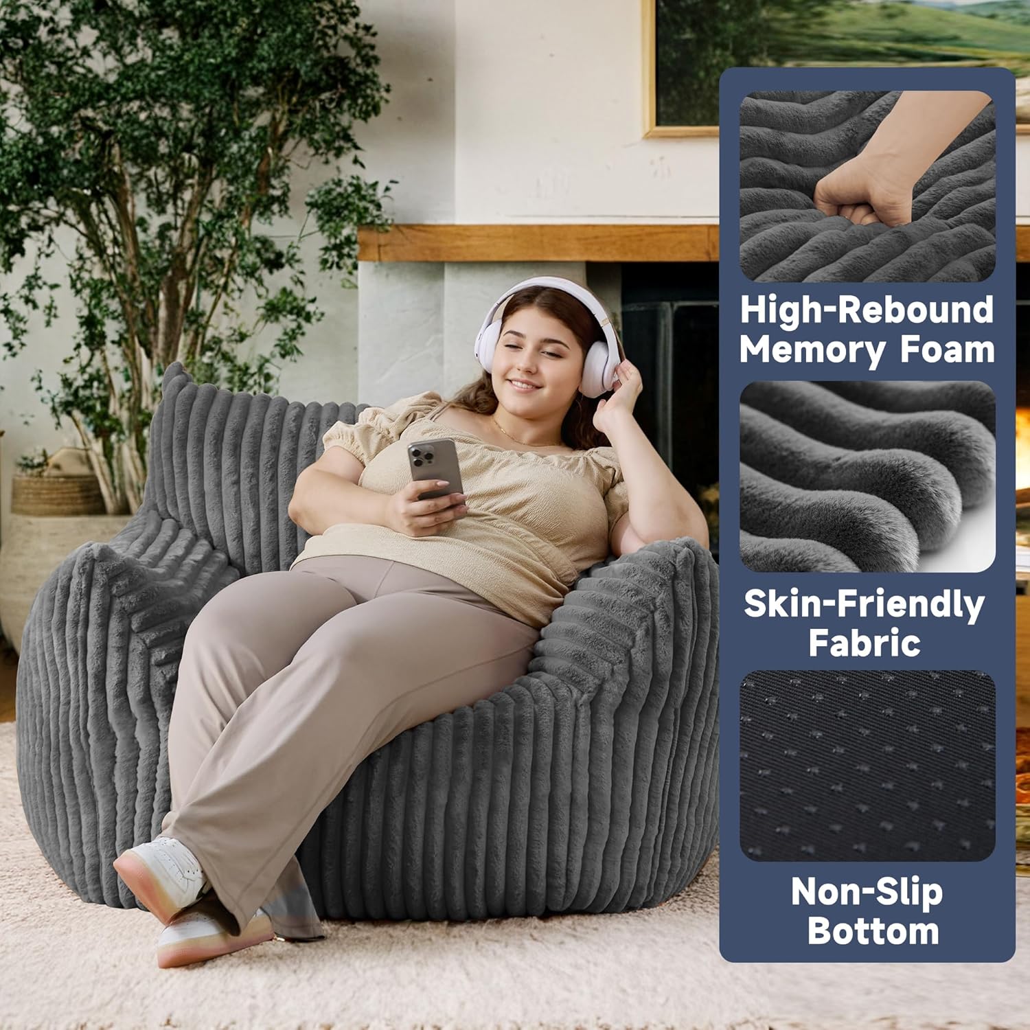 Oversized Bean Bag Chair for Adults, Giant Comfy Plush Boneless Bean Bag Couch with Filler for Kids - Reading Chair for Living Room, Bedroom & Dorm, Single Accent Chair Floor Lounger, Gray