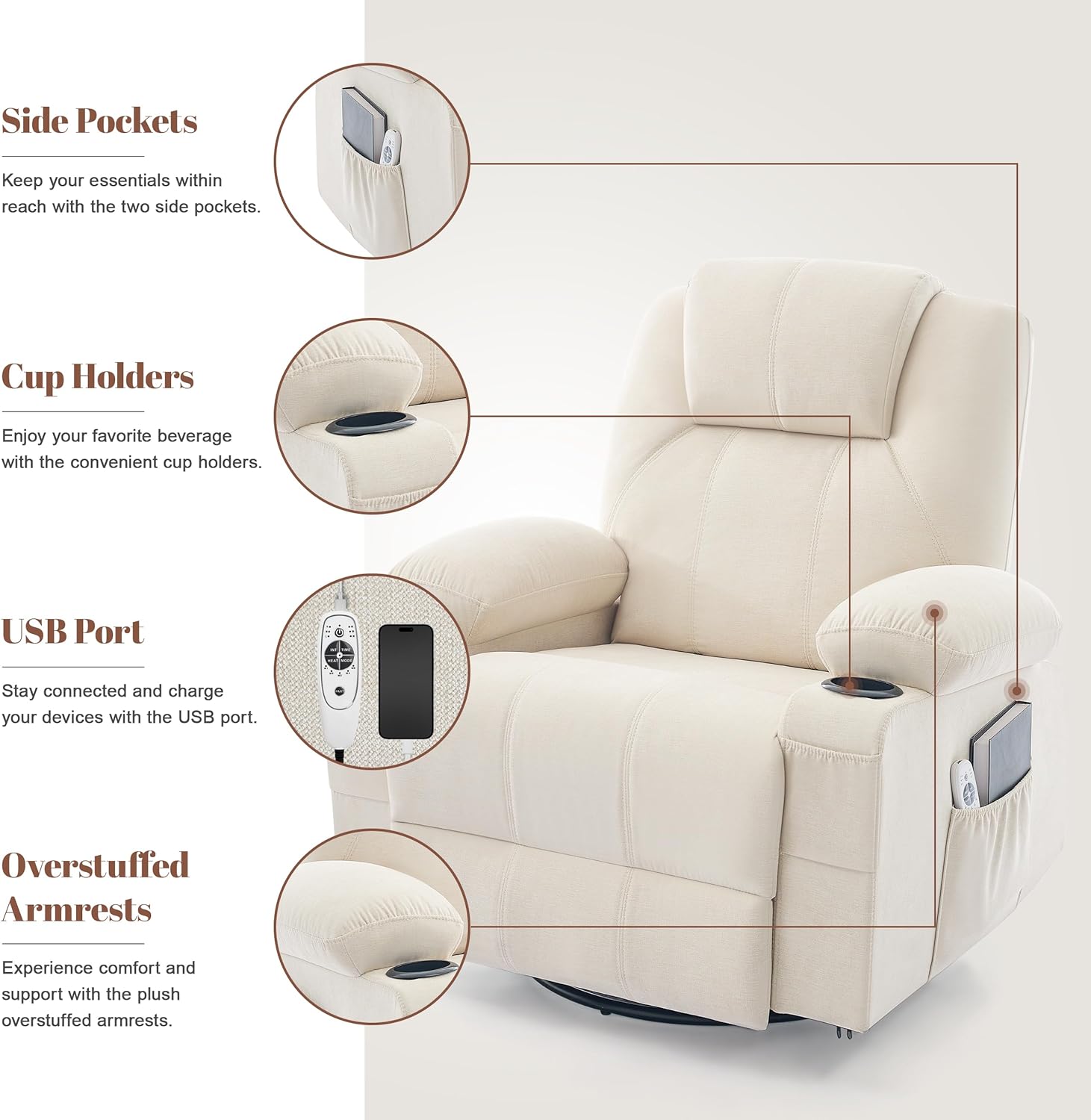 Oversized Swivel Rocker Recliner Chair with Heat and Massage, 360 Degree Swivel Rocking Single Sofa with Cup Holders and USB Port, Big Large Recliner Chair for Living Room (Fabric, Beige)