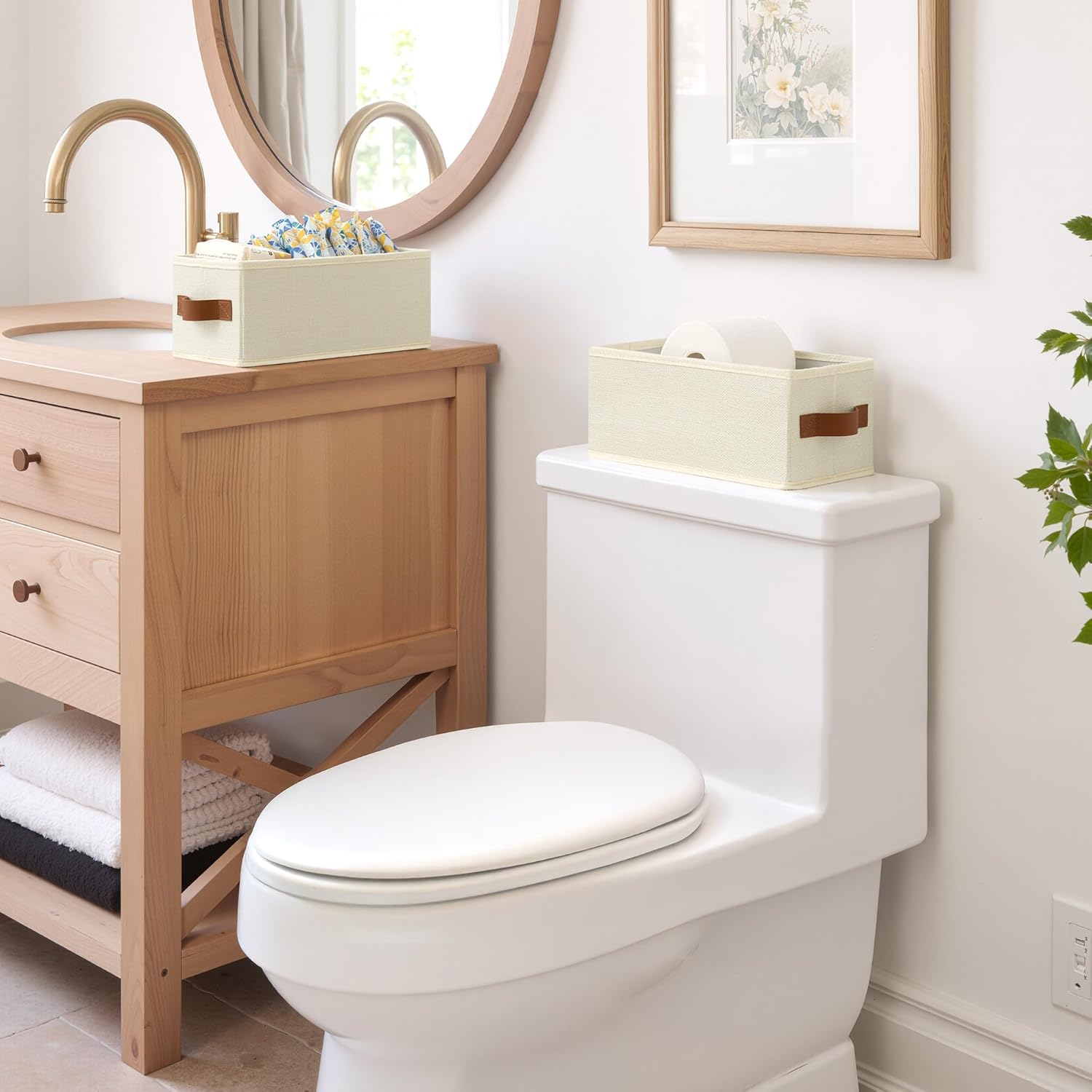 GRANNY SAYS Small Fabric Storage Bins, Storage Baskets for Shelves with PU Handles, Toilet Paper Storage, Mini Baskets for Organizing DVD, Photos, Clothes, Diaper, Sock, Cd, 3-Pack, Ivory