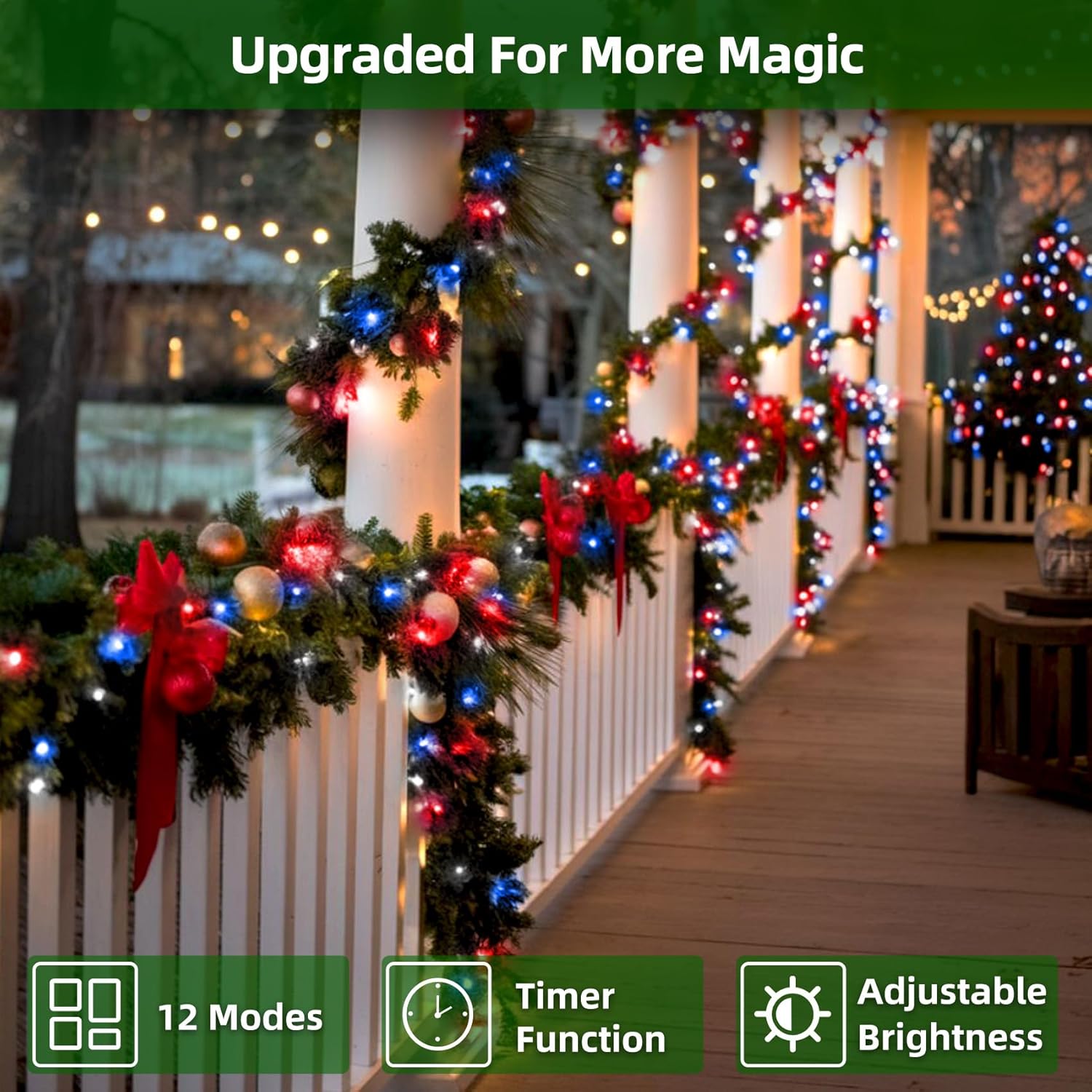 - Stress-Free Timer & Memory: No one wants to reset their Christmas tree lights every night. That’s why these outdoor string lights include a built-in timer (6 hours on, 18 hours off) so they turn on automatically at dusk and save energy while you sleep. The memory function recalls your last mode, so your favorite glow is ready every evening. Just set it once and enjoy your holiday decorations hassle-free, whether you like a gentle steady-on or sparkling party mode