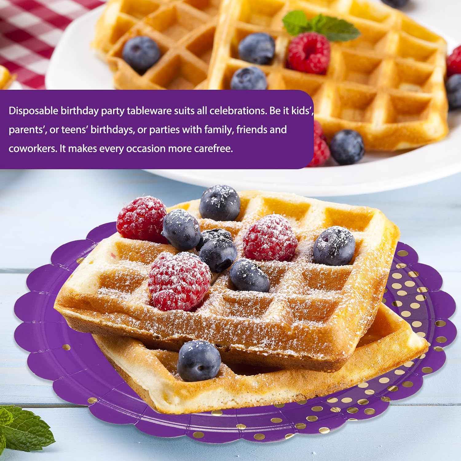 - 【SUPERIOR QUALITY】: Made from thick and food grade 350gsm heavy duty paper, environmentally friendly, odorless, heat resistant, these disposable purple plates are strong enough to hold a variety of snacks, salads, and desserts without sagging or tearing. The surface is made of a waterproof membrane, so that your purple cake plates can be used with more peace of mind.