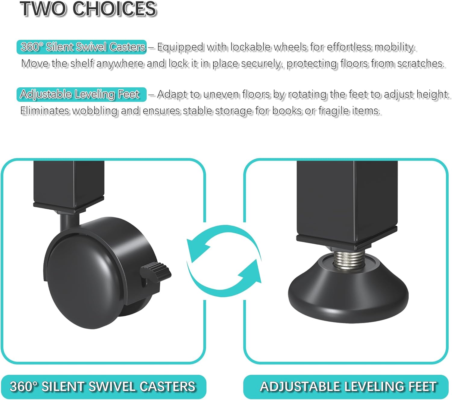 4NM 2 Tiers No-Assembly Folding Bookshelf with Wheels, Portable Rolling Storage Bookcase & Compact Side Table for Living Room, Bedroom, Kitchen, Bathroom (Rustic Brown and Black)