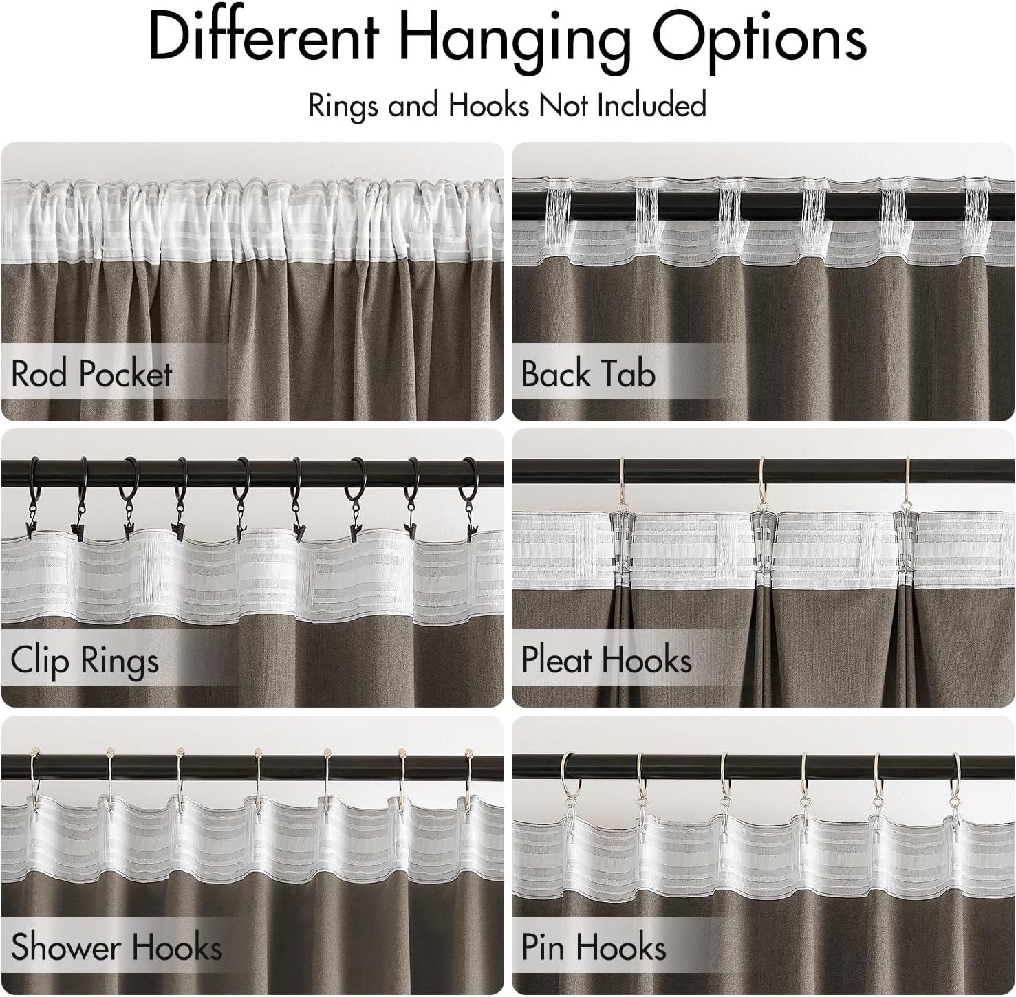 - HANGING OPTIONS: Each curtain panel has 3-in-1 top style design: rod pocket, back tab and pinch pleat. Back loop (2.3 inch) and rod pocket (3.1 inch) fit most standard rod. Curtains also can be hung with clip rings or curtain hooks. 3 ways to meet your various needs.